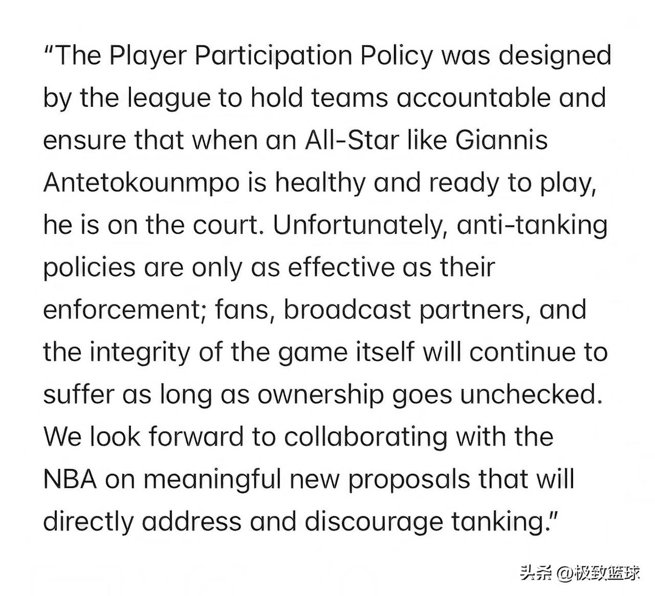 离谱!雄鹿逼字母哥休战,球员工会直接发声明撕破脸 今日,据知名记者Shams报道,雄鹿打算让当家球星字母哥直接赛季报销,剩余常规赛全部缺席,可字母哥本人却态度坚决,明确表示自己身体状态没问题,想要继续上场比赛。双方意见相悖的情况下,NBA球员工会直接发布正式声明,彻底把这件事摆到了台面上。 了解NBA的球迷都知道,字母哥可是联盟顶级球星,两届MVP得主,雄鹿的绝对核心。本赛季他已经多次遭遇小伤病,球队目前战绩也不尽人意,季后赛希望渺茫,雄鹿管理层大概率是想让他休战养伤,同时借着战绩不佳争取更好的选秀签位,这也是NBA球队常见的“摆烂”操作。但字母哥自己不乐意,他觉得自己身体已经恢复,具备上场比赛的条件,不想直接放弃本赛季剩余比赛,想要打球的意愿十分强烈。 针对这一矛盾,NBA球员工会毫不避讳地发布声明,明确表达了立场。声明里提到,联盟制定球员参赛政策,本意就是让球队担起责任,保证字母哥这样健康、随时能上场的球星可以正常出战,保障球员的参赛权利。可现实却很无奈,联盟的反摆烂政策,能不能起到作用全看执行力度,要是一直放任球队老板为了利益随意决定球员是否出战,不受任何约束,那最终受伤的不只是球迷,还有转播商,更会毁掉NBA比赛本身的公平性。球员工会也表态,愿意和NBA官方合作,拿出切实可行的新方案,从根源上遏制球队摆烂的行为。 其实这件事看似是球队和球员的分歧,本质上是联盟摆烂乱象的又一次暴露。很多球队一旦失去季后赛希望,就会不顾球员意愿,强行让核心球员休战,美其名曰养伤,实则是为了摆烂抢高顺位选秀权。可球员也是有职业态度的,字母哥想打球,是对赛场的热爱,也是对自己职业生涯的负责,不想白白浪费比赛机会。 球迷们花钱看球,想看的就是球星上场拼搏,要是球队动不动就为了利益让核心休战,比赛观赏性大打折扣,受伤的还是真心热爱篮球的观众。球员工会这次发声,算是替球员说出了心声,也给联盟敲响了警钟。 说到底,NBA是商业联盟,但也不能只讲利益忽略球员意愿和比赛公平。希望联盟能尽快出台更严格的反摆烂措施,既保护球员的参赛权,也能让比赛回归纯粹,别让功利性的摆烂,寒了球员和球迷的心。