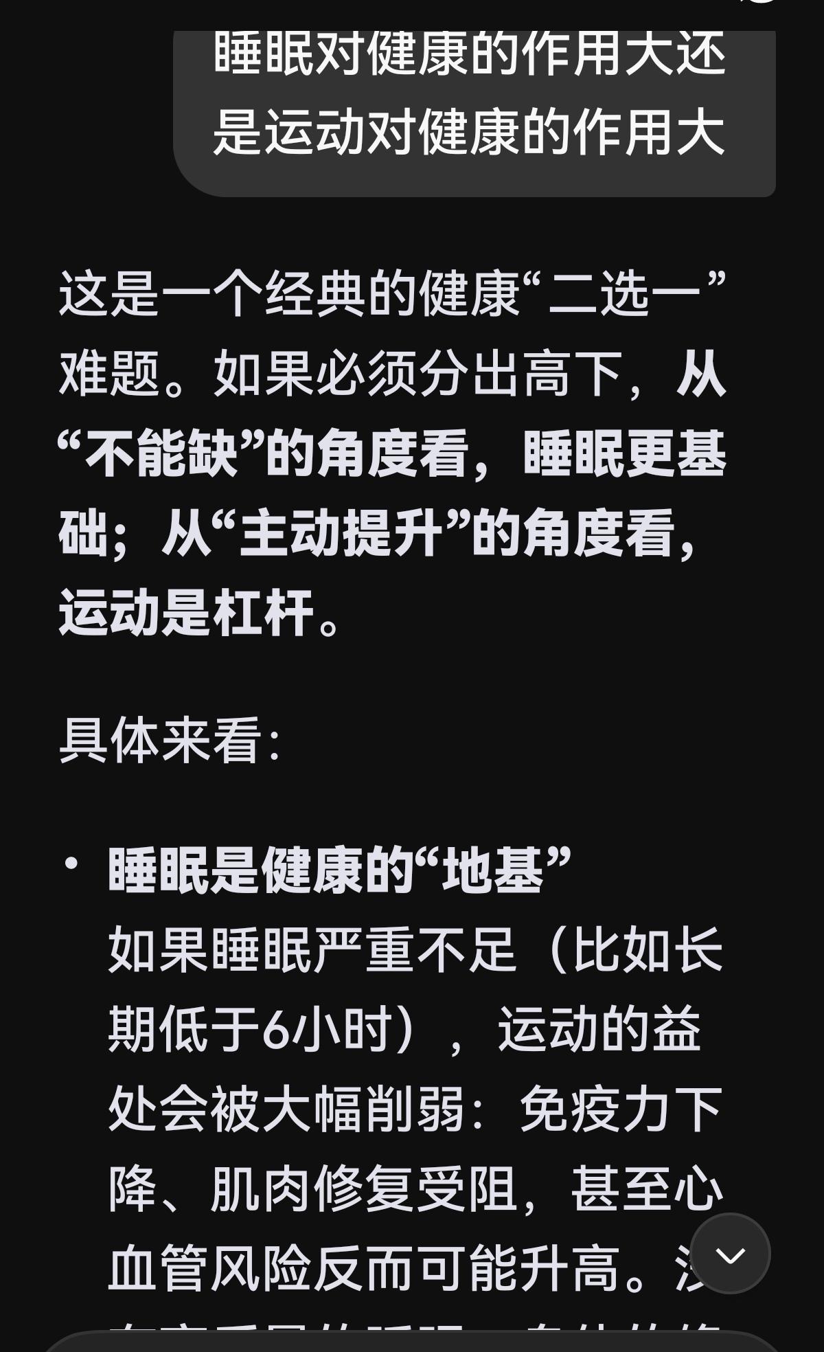 从张雪峰英年早逝拷问一个健康问题:睡眠与运动哪个对健康作用大 昨天教育大V张雪峰突然病逝,他的朋友圈证明他是一个经常跑步的人,截止3月23日他这个月跑步累计已达72公里。 不是说生命在于运动么? 据悉张雪峰还是一个忙于工作而长期缺少睡眠的人,不禁又想起15年前功成名就的复旦博士于娟写的书《此时未完成》,她未满33岁便患癌离世。 于是把这个运动与睡眠孰大的问题问DeepSeek,它是这样答复的: 这是一个经典的健康“二选一”难题。如果必须分出高下,从“不能缺”的角度看,睡眠更基础;从“主动提升”的角度看,运动是杠杆。 具体来看: 睡眠是健康的“地基”。 如果睡眠严重不足(比如长期低于6小时),运动的益处会被大幅削弱:免疫力下降、肌肉修复受阻,甚至心血管风险反而可能升高。没有高质量的睡眠,身体的修复、激素调节和大脑清理都无法完成。可以说,睡眠是“1”,运动是后面的“0”。 运动是健康的“放大器”。 在保证睡眠的前提下,运动能带来睡眠无法替代的好处,比如强化心肺功能、增加肌肉与骨密度、改善代谢、释放内啡肽。对提升生活质量和延长“健康寿命”来说,运动的作用非常关键。 两者会相互影响。 规律运动能显著改善深睡眠,而优质睡眠又能提升运动表现和恢复能力。如果时间有限,优先保睡眠(7-9小时),再穿插短时高效运动,比牺牲睡眠去运动更划算。 一个实用的判断标准:如果你睡不够7小时且白天精力差,那当前改善睡眠的优先级高于增加运动量。如果你睡眠充足但久坐不动,那么动起来就是回报率最高的健康。 最后把于娟用生命泣血而书的几句话献给还在天际盲飞的“鸿鹄之士”: 1.在生死临界点,所有的加班熬夜都显露出它们狰狞的本相——慢性自杀。 2.当生命开始倒计时,职称和房车突然轻得像被风吹散的蒲公英。 3.看着窗外新绿的梧桐叶,突然懂得:活着不是基础选项,而是终极奖赏。