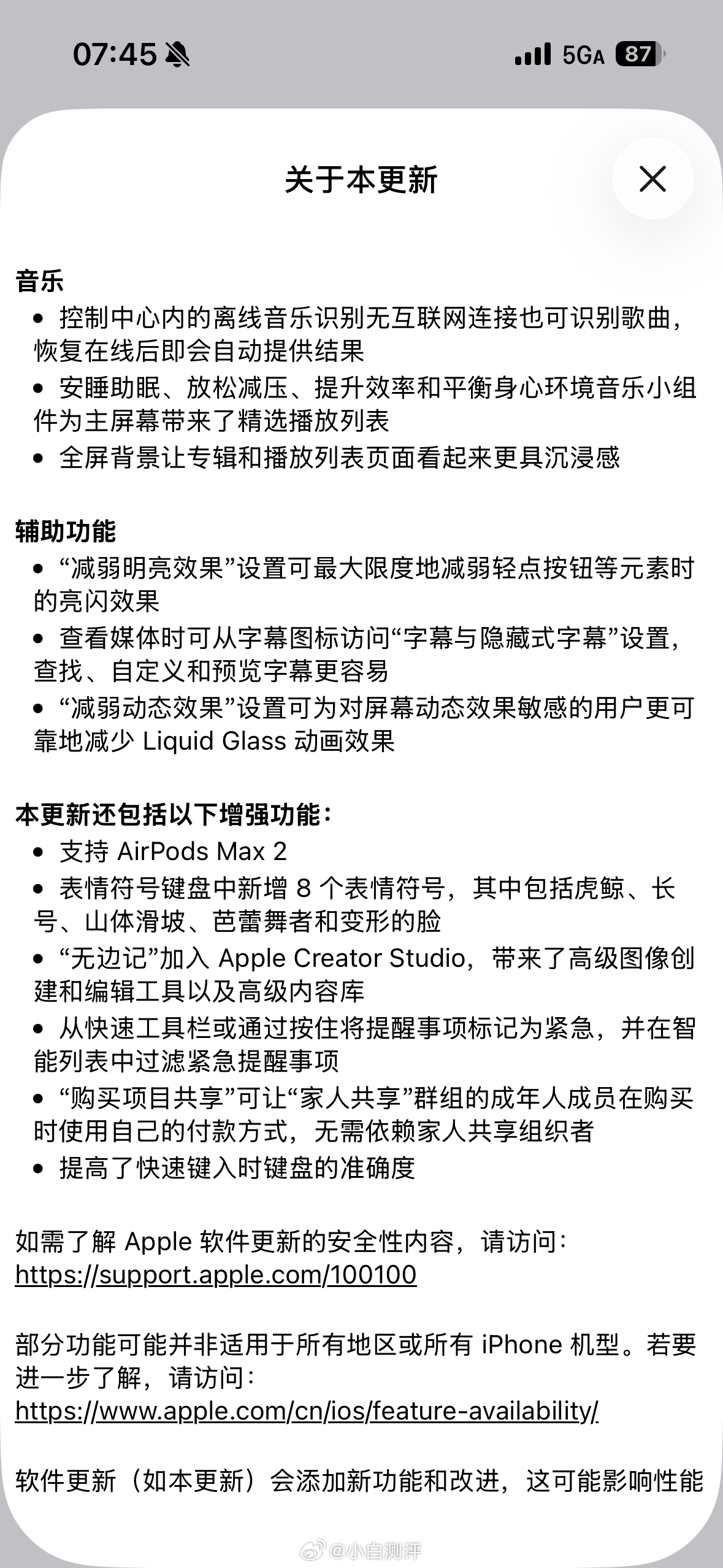 苹果推送iOS 26.4正式版主要更新:1.音乐新增全屏背景;2.辅助功能新增“减弱明亮效果”设置,可最大限度地减弱轻点按钮等元素时的亮闪效果,对屏幕动态效果敏感的用户可减少 Liquid Glass 动画效果;3.新增支持 AirPods Max 2;4.表情符号键盘中新增8个表情符号;5.“无边记”加入 Apple Creator Studio等等