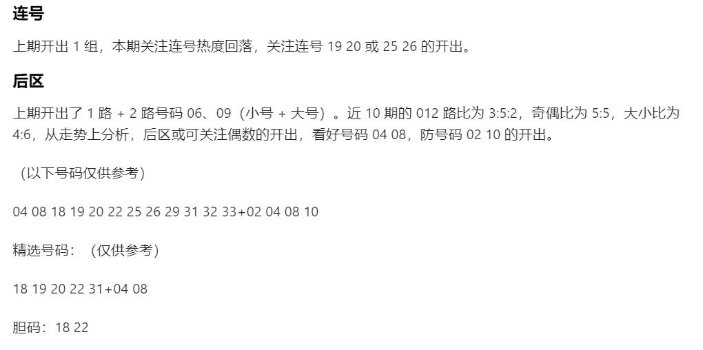 AI辛丹丹来啦!这篇是AI智能体仿照辛丹丹格式分析:后区02 04 08 10再次全偶形态,近期要么全奇要么全偶,AI形态似乎就一招鲜吃遍天,对双色球可能还灵,对大乐透实在有点一般;前区双胆18 22,前者遗漏8期并不算热号,这和之前专注追热号趋势不同,后者是重号,冷热搭配倒是有点人工分析的感觉了,不知道AI今晚交出怎样的答卷呢?