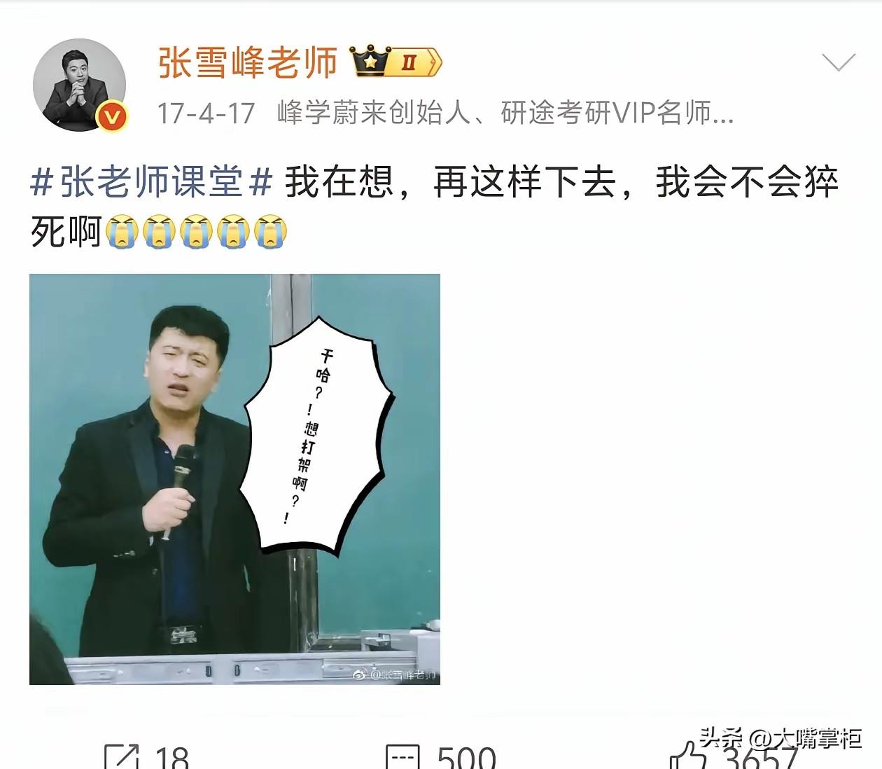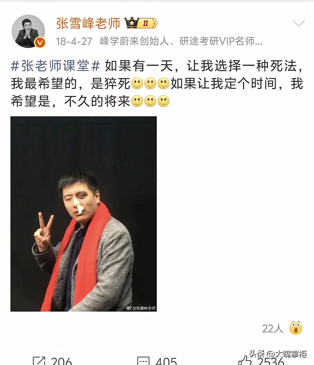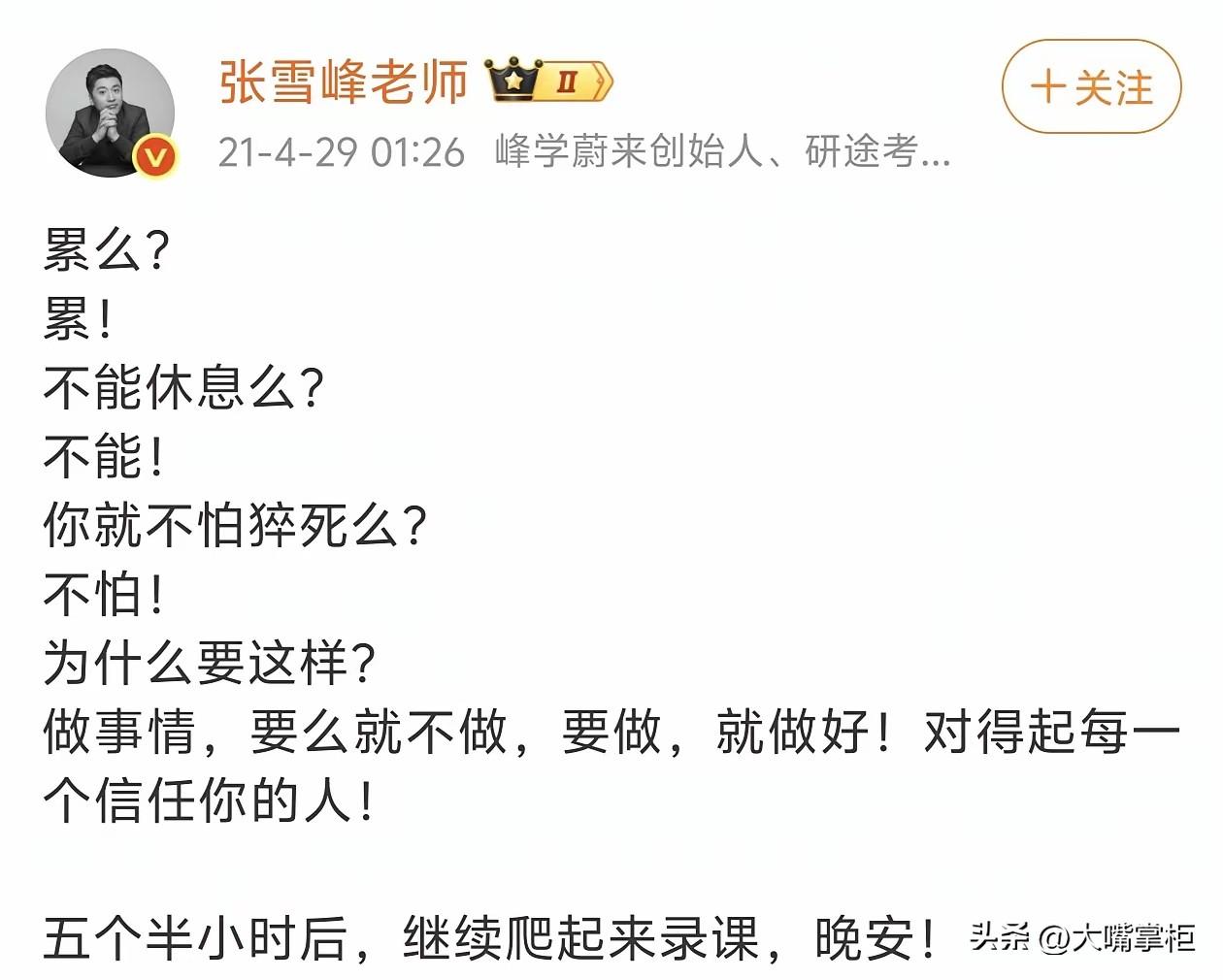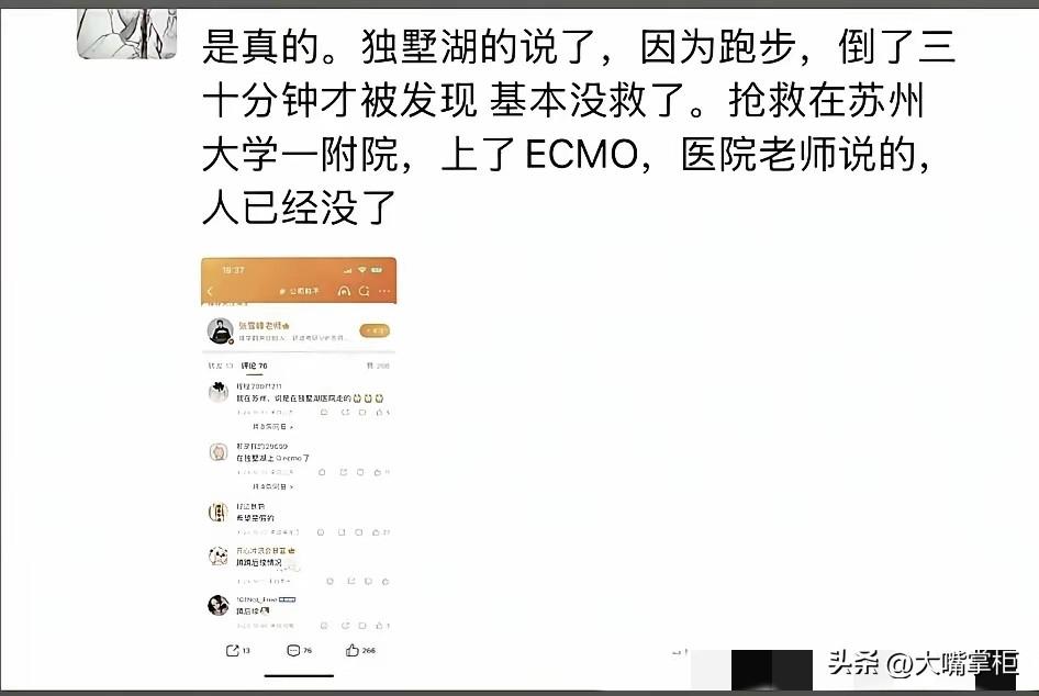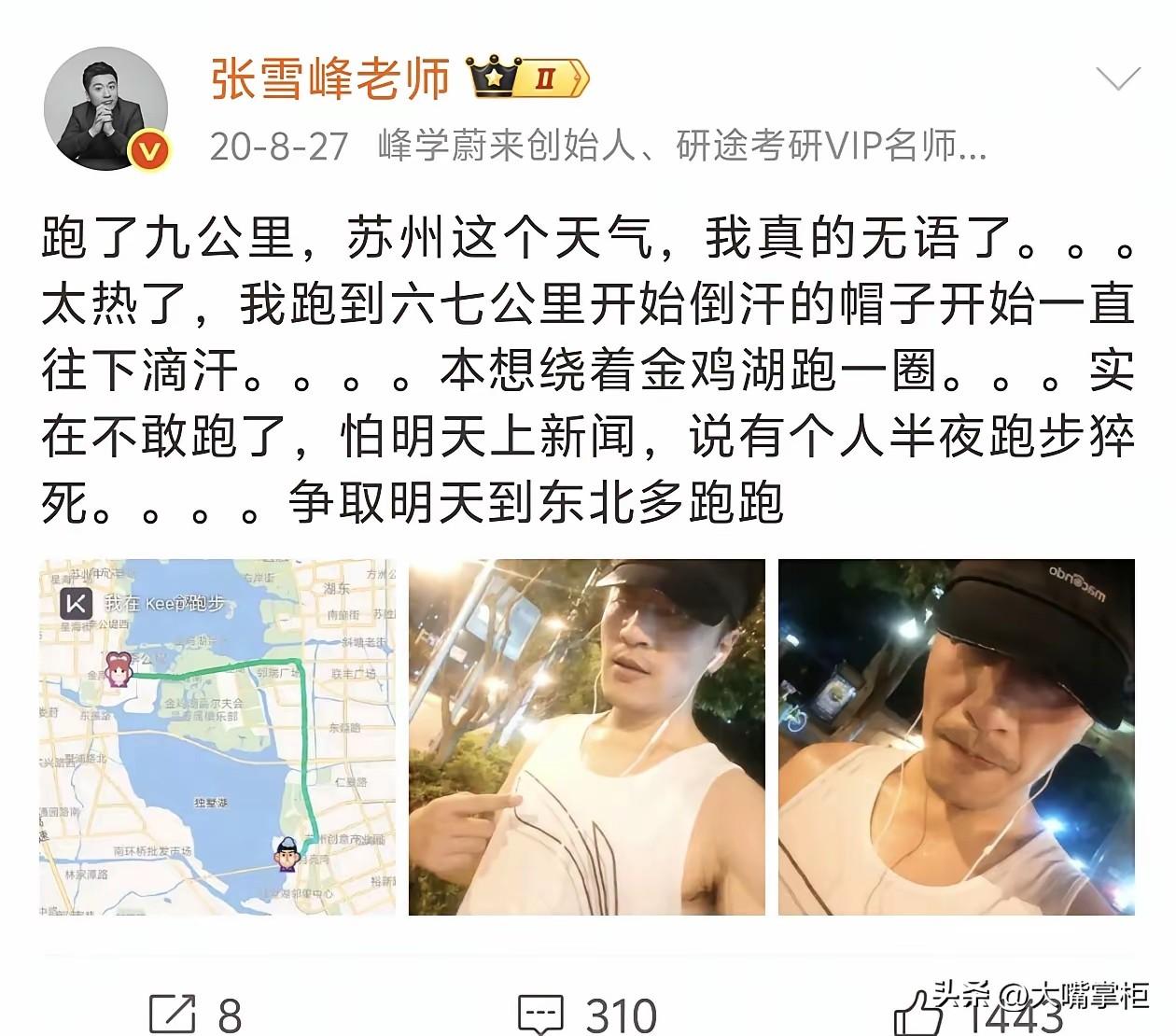 被心源性猝死刷屏,才发现它比心脏骤停更凶险。 心脏骤停如果身边有人,哪怕是通过急救电话指导救治,都有很大的生还希望。但心源性猝死,抢救难度就大多了,即便发生在医院,抢救回来的几率也低得多,黄金抢救时间可能就几分钟。 张雪峰出事时正值午休时间,倒地时没有被及时发现,直到30分钟后才被紧急送医,哪怕是再厉害的心脑专家,都已经回天无力了。 看张雪峰以前的社交账,他不止一次提到猝死这个词,而且不止一次担心自己太劳累猝死。 在2020年8月,他有一次半夜在金鸡湖边跑步,因为天气太热,跑了9公里后停下来了,他担心第二天会有新闻,有人半夜在金鸡湖边跑步猝死,现在回头看,这段话在今天看来像是一个z语,十分形象的复刻在了他的身上。