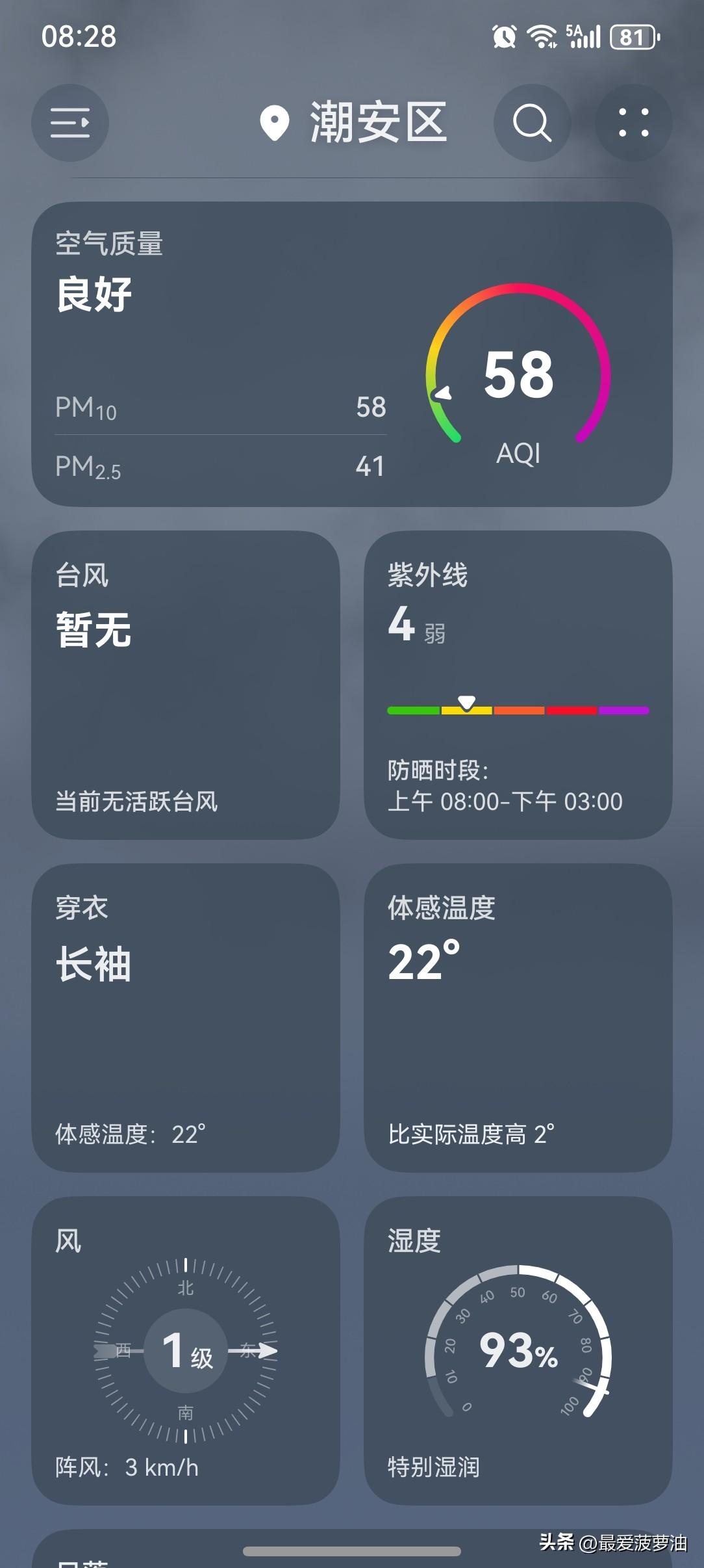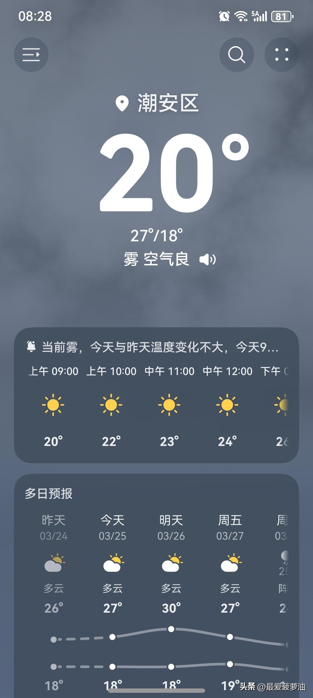 广东人的夏天来了! 25~26日,韶关及清远市县多阴雨天气;其余大部市县可见阳光,早晚清凉有轻雾或雾,昼夜温差大。27日开始,我省降水将趋于频密,雨势趋于明显。 今天(25日),潮州喜提一个多云天气,气温18~27℃,此刻气温20℃,体感温度22℃。 哦豁~今天的气温上升得这么快,一大早气温就已经华丽丽地升到了20℃,体感温度也是绝了,22℃!比实际气温还高呢! 广东人的夏天是真的来了!万万没想到啊!今年的夏天来得这么早,这么急!一下子就热了起来,这两天空调风扇可能都要用起来了! 一起来看看今天的天空吧!一大早阳光灿烂,十分耀眼。天气画风与昨天相差甚远,昨天早上开局就雾、雨、风……今天只有阳光普照! 今天的天气从整体来讲,依然值得拥有一个五星好评! 如此天气!元芳,你怎么看? [我想静静][大笑][笑哭][捂脸][我想静静][大笑][笑哭][捂脸]