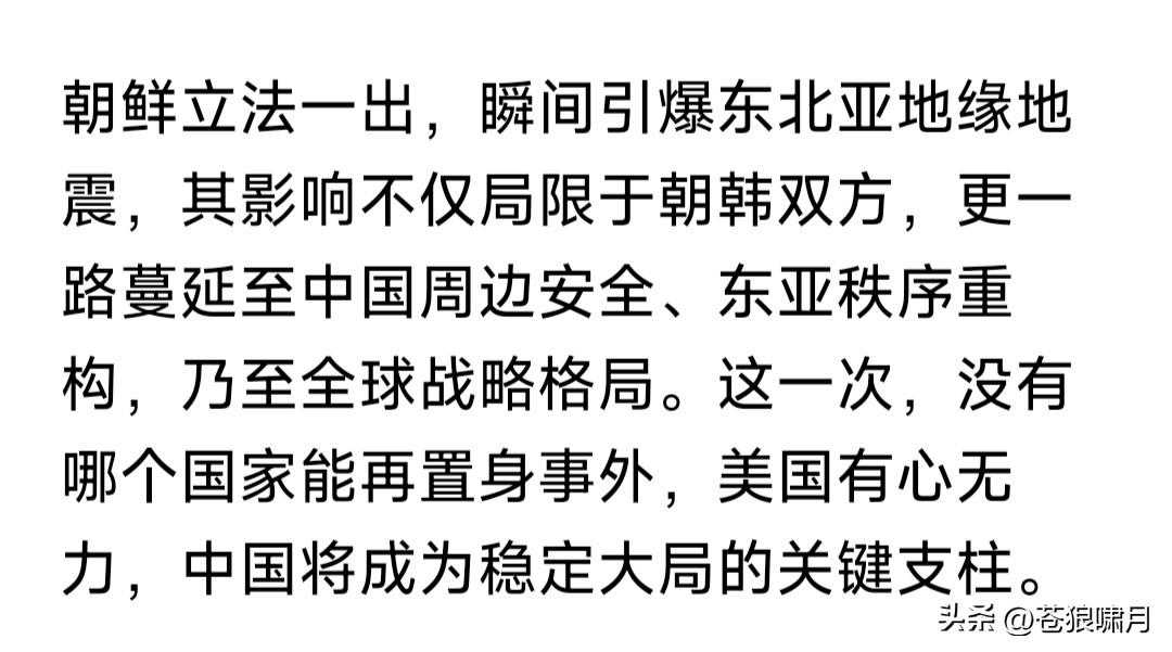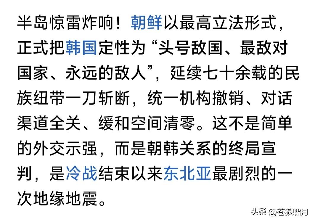 看到这个消息,苍狼大吃一惊:半岛北方以最高立法形式,将南方定性为“头号敌国,最敌对国家,永远的敌人”! 不由想起1800年前,曹植写给哥哥曹丕的“七步诗”:煮豆持作羹,漉菽以为汁。萁在釜下燃,豆在釜中泣。本自同根生,相煎何太急!避免杀身之祸。 想到1800年后的今天,还在发生“兄弟相残”“同室操戈”的悲剧?难道社会发展到今天,仍然没有丝毫进步吗?不由感到无尽的悲哀!人类要往何处去? …………