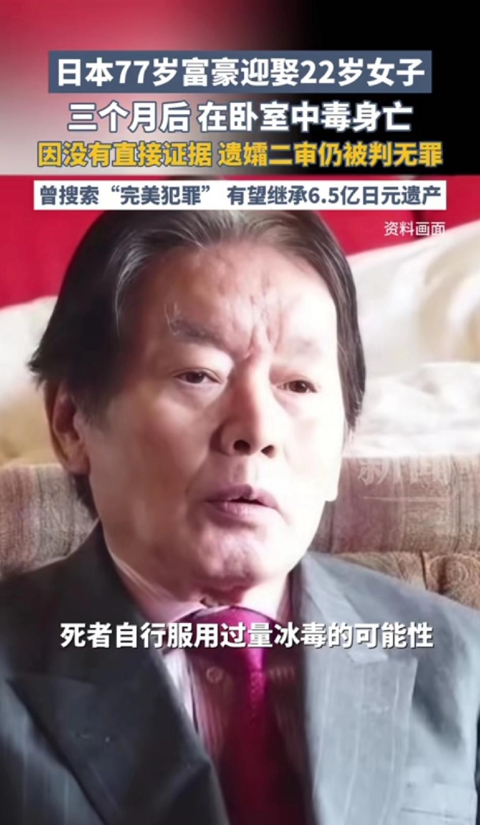 日本77岁富豪迎娶22岁女子,三个月后在卧室中毒身亡,77岁富豪野崎幸助,资产数十亿日元,2018年和小他55岁的22岁女子须藤早贵结婚,这年龄差就够引人注目的。才结婚三个月,野崎就在卧室因冰毒急性中毒身亡。 77岁娶22岁小娇妻,二人相差25岁,富豪的喜好一直没变,只喜欢年轻的,77岁的老人,以为娶了小娇妻就能像年轻时候一样,滥用各种药物,最终导致死亡。 女孩陪了富豪3个月,就能继承6.5亿遗产,这样算下来这笔买卖还是很合算的。 检方指控须藤早贵谋杀,毕竟她从毒贩处买过疑似冰毒物质,还搜过“老年人 完美犯罪”。但须藤早贵一直否认。一审法院判定无法排除野崎自行误服的可能,判须藤无罪,检方不服上诉。 3月23日二审,还是维持无罪判决。这结果一出来,外界关注须藤或能继承约2800万元人民币遗产,这背后的真相,真是让人浮想联翩啊。