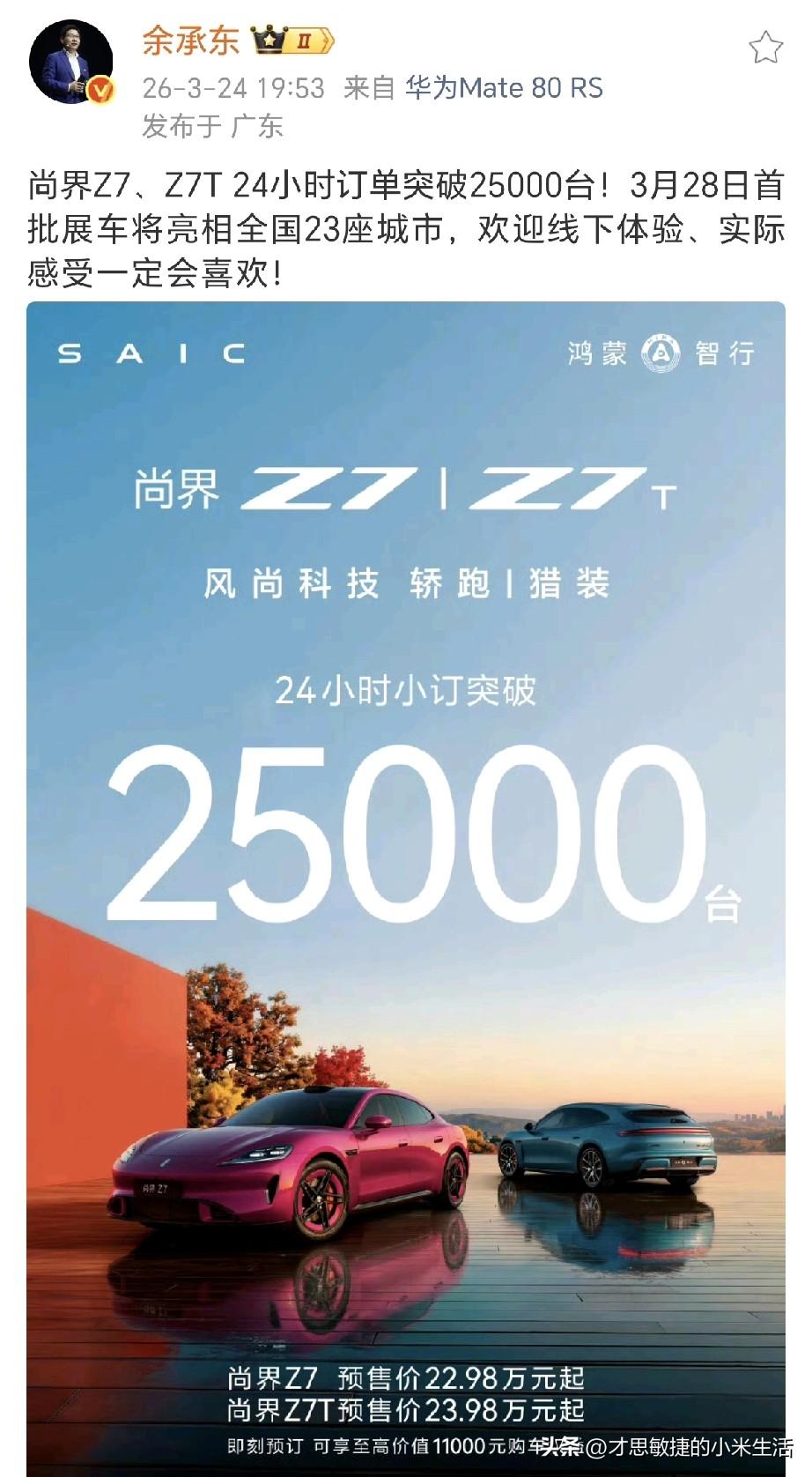 余承东:问界黑马,M6 来了! 网友:问界M6黑马实锤了! 华为余总正式官宣,问界M6 24小时订单突破60000台! 在今年2月初,余总就誓言旦旦地说问界M6 黑马来了! 从今天余总公布的数据看,余总吹过的牛又实现了,在问界100万辆下线的时候,余总就说问界出一款卖爆一款,问界真的是出一款爆一款啊,太牛了,真应了那句话,能超越余总的只有他自己! 不知是问界M6卖爆了,比新一代更期待的尚界Z7也卖爆了,尚界Z7、Z7T 24小时订单突破25000台!压力给到了雷总!