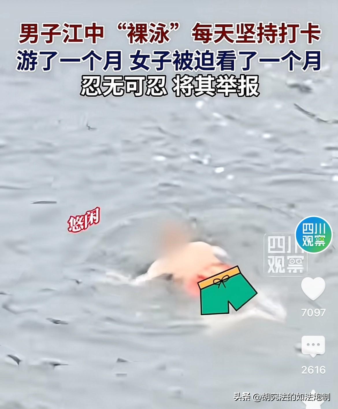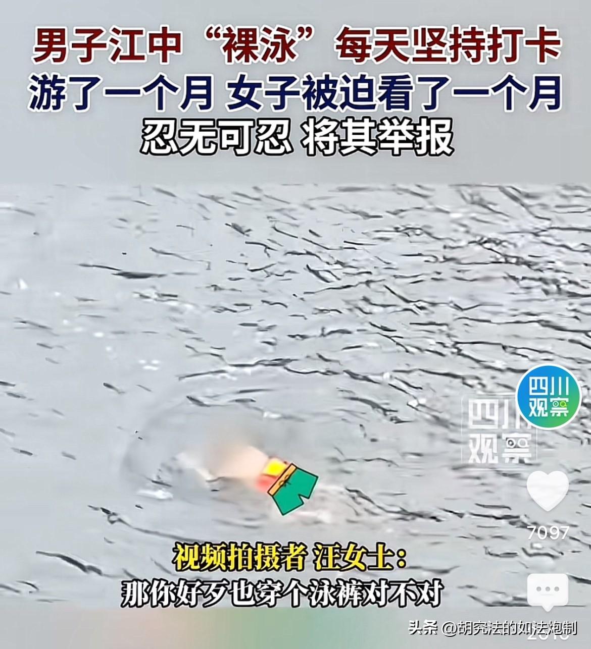 “一个定时来游,一个定时来看!”四川乐山,一女子每天坚持到江边晨练,却发现一男子在江中裸泳,连泳裤都不穿,丝毫不顾及其他人的感受。女子被迫看了一个月后,忍无可忍选择举报。女子:40多岁的人了,要是被别人看到了咋办?网友:该不会是没仰泳吧? 汪女士遇到了一件非常奇葩的事情,在连续目睹一个月之后,最终忍无可忍选择了举报。 事情的大致是这样的。汪女士有晨练的习惯,每天天一亮,汪女士便会准时起床,简单的洗刷之后便出门散步。 在汪女士的家附近,正好有一条大河,早上去河边走一走,清新的空气让人感觉浑身舒坦。 不仅汪女士有这样的想法,附近很多居民同样也喜欢到河边锻炼身体。 这天,汪女士像往常一样来到了河边锻炼,他无意中向河里瞥了一眼,发现有个人正在河里游泳,是个男人,年龄大概四五十岁。 汪女士见状,心里不由得敬佩起来。能够在这种水域里游泳的大都是有本事的人。他一直也想学游泳,奈何身体条件不行。 想到这汪女士不由得多看了两眼,不过随后她就发现情况好像有点不一样。 起初他还以为自己看错了,忍不住揉了揉眼睛,当他看清眼前的景象之后,连忙闭上了眼睛。 在河里游泳,好歹穿一条泳裤,这人怎么这样子呢? 汪女士感觉自己的眼睛都不干净了,心情郁闷的回到了家里。 等到了第2天,汪女士再次来到了河边,由于有了昨天的经历,汪女士心里还嘀咕着,那个人不会又来游泳了吧? 想到这,汪女士不由得向河里张望,结果还真没让他失望,那名男子果然来游泳了,依旧是不穿泳裤。 汪女士被辣的闭上眼睛,内心也有些慌乱,只能不断的提醒自己“非礼勿视”,无比挣扎的结束了一天的晨练。 在接下来的一个月时间里,汪女士每天准时来到河边晨练,而那名游泳的男子就像和汪女士约定好了一般。只要汪女士来,他就会在水里游泳。 汪女士实在受不了了,他甚至有好几次想亲自告诉那名男子,游泳的时候能不能穿一条泳裤,多少也得考虑一下其他人的感受。 可汪女士张不开嘴,还担心男子说她多管闲事。于是便选择了举报并向媒体进行曝光。 为了证实自己所言非虚,汪女士甚至还提前拍摄了男子游泳的视频。等记者过来采访时,王女士便把这段视频交给记者看。 在视频中,果然有一中年男子正悠闲的在水里游泳。 汪女士表示,真不是他多管闲事,实在是忍无可忍了,天天如此,都一个月了,每天不穿泳裤就在水里游泳,这要是被未成年人看到了,影响有多不好? 有人调侃,真的佩服这两个人的自律,一个每天按时来游泳,另一个每天按时来看,就跟约定好了一样。就是有一点想不明白,汪女士说她被迫看了一个月,到底是谁强迫他的? 男子的做法确实有些不对,在公共区域更应该时刻注意自己的言行,不能只顾着自己自由自在了,却忽略了其他人的感受。 正如汪女士所说,如果被未成年人撞见了,肯定会对未成年人造成不好的影响。 《治安管理处罚法》第44条规定,在公共场所故意Ll身体,情节恶劣的,处五日以上十日以下拘留。 虽然在法律上已经有了明确的规定,不过需要注意的是,男子不一定会受到相应的处罚。男子在河里游泳,虽然行为不雅,不过并没有故意影响他人,而且情节也没有汪女士所说的那么恶劣,可能仅仅会被批评教育。 这个案例也提醒广大朋友,在公共场合一定要注意自己的言行举止,最起码不能影响到其他人的正常生活。 对此你怎么认为?
