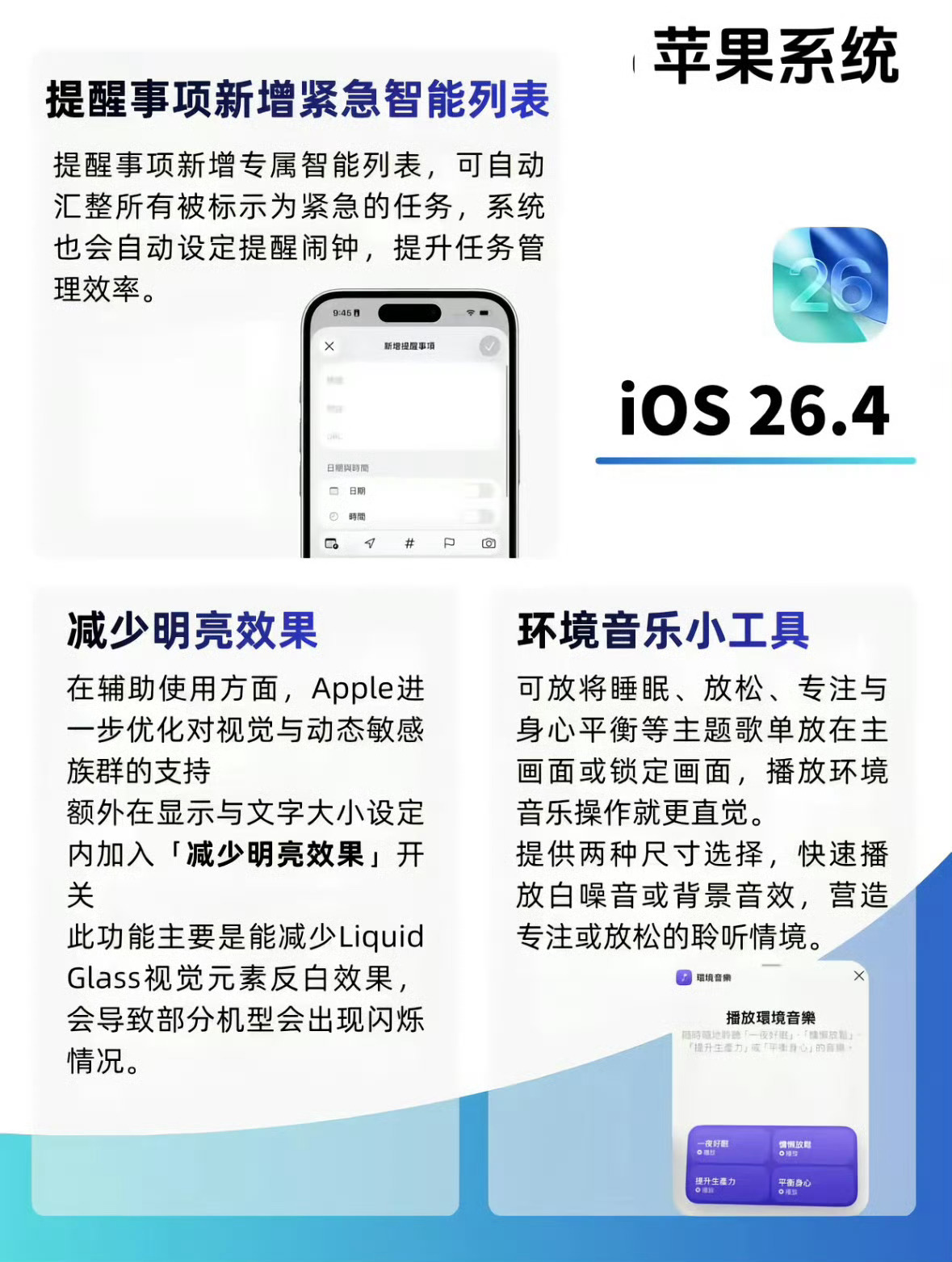 iPhone大量新功能上线慢慢开始加入一些AI基础功能了,还新增了一些emoji表情,和调整显示效果等,当然也修复了一些BUG……算是比较大的一次版本更新了。