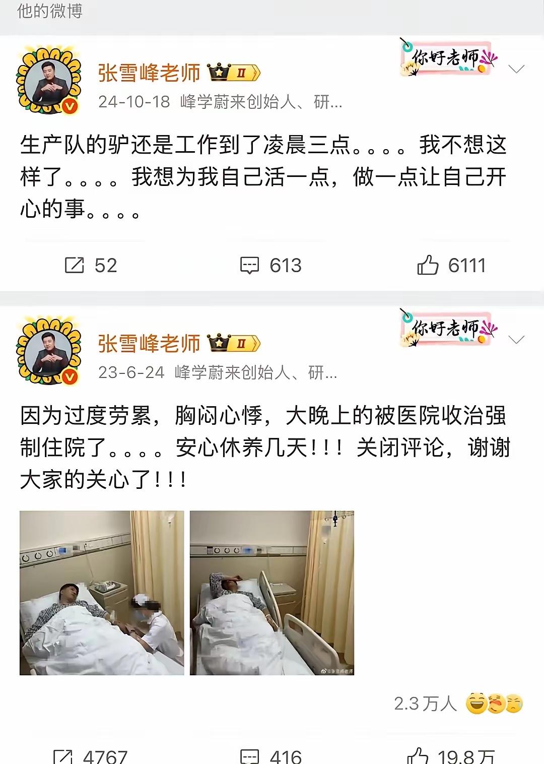 只活了41岁!张雪峰英年早逝,给所有人狠狠提了醒,下面这5条警示一定要记牢: 1)健康永远排第一 事业再成功、赚钱再多,没了健康全是零。长期高压熬夜、连轴转工作,看似努力,实则是拿命换前程,得不偿失。 2)身体预警千万别忽视 他早几年就因心脏问题住院,身体已经亮了红灯,却依旧没重视,继续高强度打拼,近段时间还爱上了极限长跑,身体的小毛病、不适感,都是救命信号,不能硬扛忽视。 3)极限运动不适合就别碰 本身有心脏基础病,本该静养,避免剧烈运动,却盲目挑战极限运动,反而加重心肺负担,终酿悲剧,运动需贴合自身体质。 4)别把拼命当常态 人生不是冲刺,学会劳逸结合、放下焦虑,身心都放松,轻装上阵才能走得更长远。 5)平和安稳是王道 追求成功、流量、财富很正常,但别因此牺牲陪伴、睡眠和生活。人真正的底气,不是赚了多少钱,而是能健康安稳地走完一生。