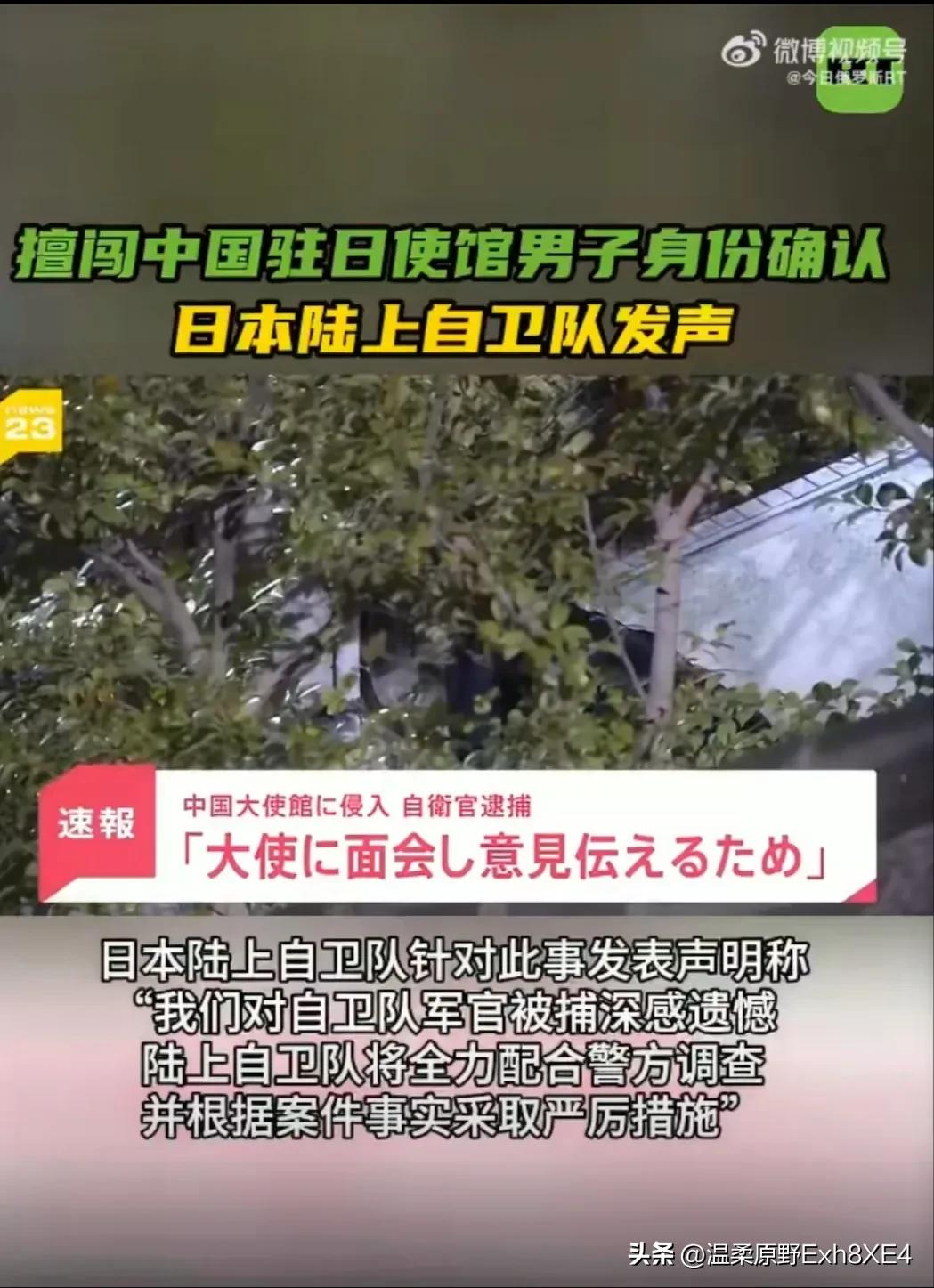 日本男子持刀强闯我国驻日大使馆,所属陆上自卫队竟然这样声明回应: “我们对自卫队军官被捕深感遗憾,陆上自卫队将全力配合警方调查,并根据案件事实采取严厉措施。” 声明从头到尾未向我们道歉! 据悉,这名男子23岁,是日本陆上自卫队的现役三等陆尉。 3月24日上午,从邻接大使馆的建筑翻墙闯入,随身携带刃长18厘米的刀具。在被使馆安保人员制服后,还曾威胁说:“要以神的名义杀死中国外交人员。” 网友:又试探?要不你们宣布走失一个士兵吧,这样事情简单点[大金牙]