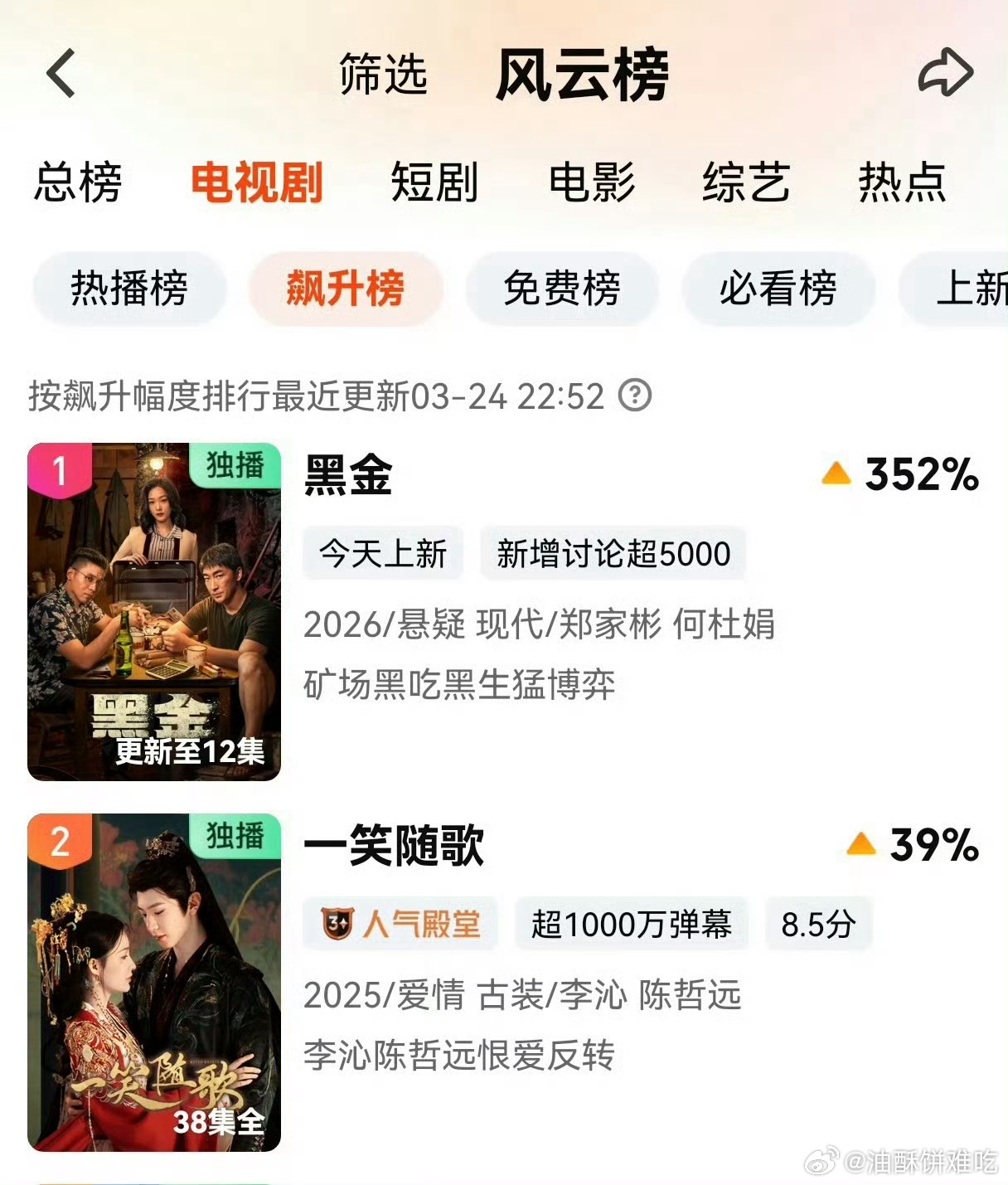 陈哲远一笑随歌飙升榜第二一笑随歌爱奇艺飙升榜第二了,这部剧才是真正的颜值与演技全部在线,只要有曝光,剧粉马上跟上,当初追剧体验感太好了,随便发一句台词,评论区都是跟我讨论剧情的