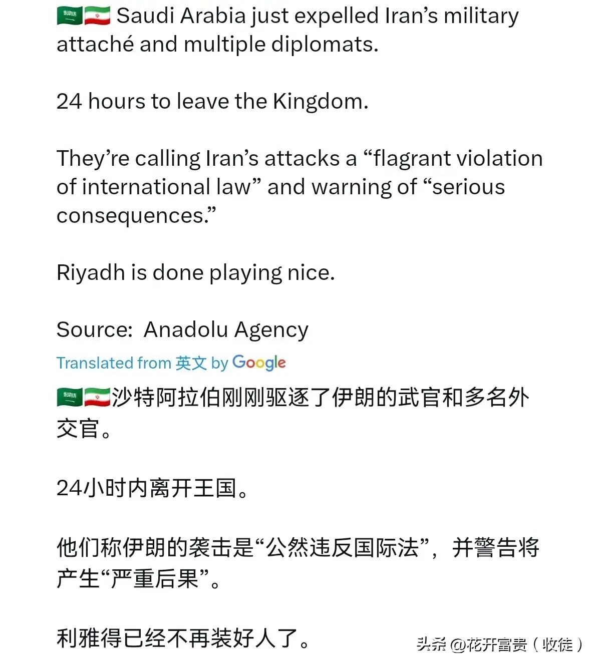 沙特深夜下死命令,伊朗5名外交官24小时必须滚蛋,沙伊和解告急。 3月21日晚,沙特外交部直接甩出强硬声明,没有任何缓冲余地:将伊朗驻沙特大使馆武官、武官助理,外加另外3名使团成员,全部列为不受欢迎的人,勒令这5个人在24小时内离开沙特境内。 这一刀捅得又准又狠,根本不是普通外交摩擦。就在几天前,卡塔尔刚驱逐过伊朗武官,沙特立刻跟上,摆明了是海湾国家抱团反制伊朗。沙特官方说得很明白:伊朗近期频繁对沙特本土发动导弹、无人机袭击,能源设施、空军基地接连遇袭,已经严重踩破沙特的国家安全红线。 回想2023年,沙伊在北京握手复交,一度让全世界看到中东缓和的希望。可现在,一场接一场的军事冲突、一轮又一轮的能源打击,把这份脆弱的和解彻底撕碎。更危险的是,武官是两国军事沟通的核心纽带,直接驱逐等于切断了最关键的安全对话渠道,后续稍有不慎就可能擦枪走火。消息一出,国际油价立马跳涨,波斯湾航运警报全线拉响。 沙伊关系急转直下,中东这潭水,这下彻底搅浑,你怎么看,欢迎评论区留言聊聊。