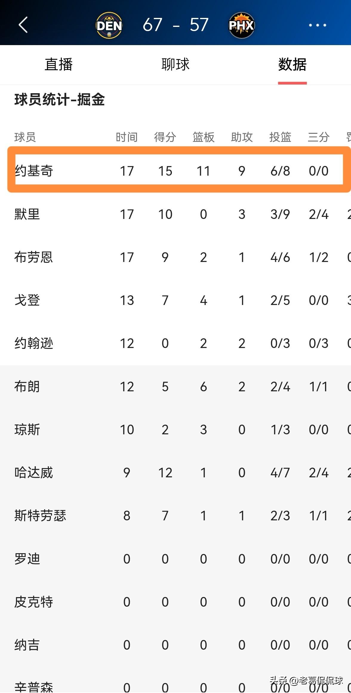 掘金超级巨星约基奇真是太多才多艺了!在今天掘金客场挑战太阳的比赛中,目前双方半场战罢,掘金凭借着约基奇的全能表现以67:57领先对手10分。在前两节比赛中,约基奇首发出战17分钟,投篮8中6,其中罚球3中3非常高效的砍下15分,还有11篮板9助攻,没有出现任何的失误,他的场上正负值为+5。 虽然很多人嘲讽约基奇是一个数据刷子,但是在我眼里,约基奇不仅是当今联盟最多才多艺的球员之一,而且是NBA历史上最全面的球员之一。