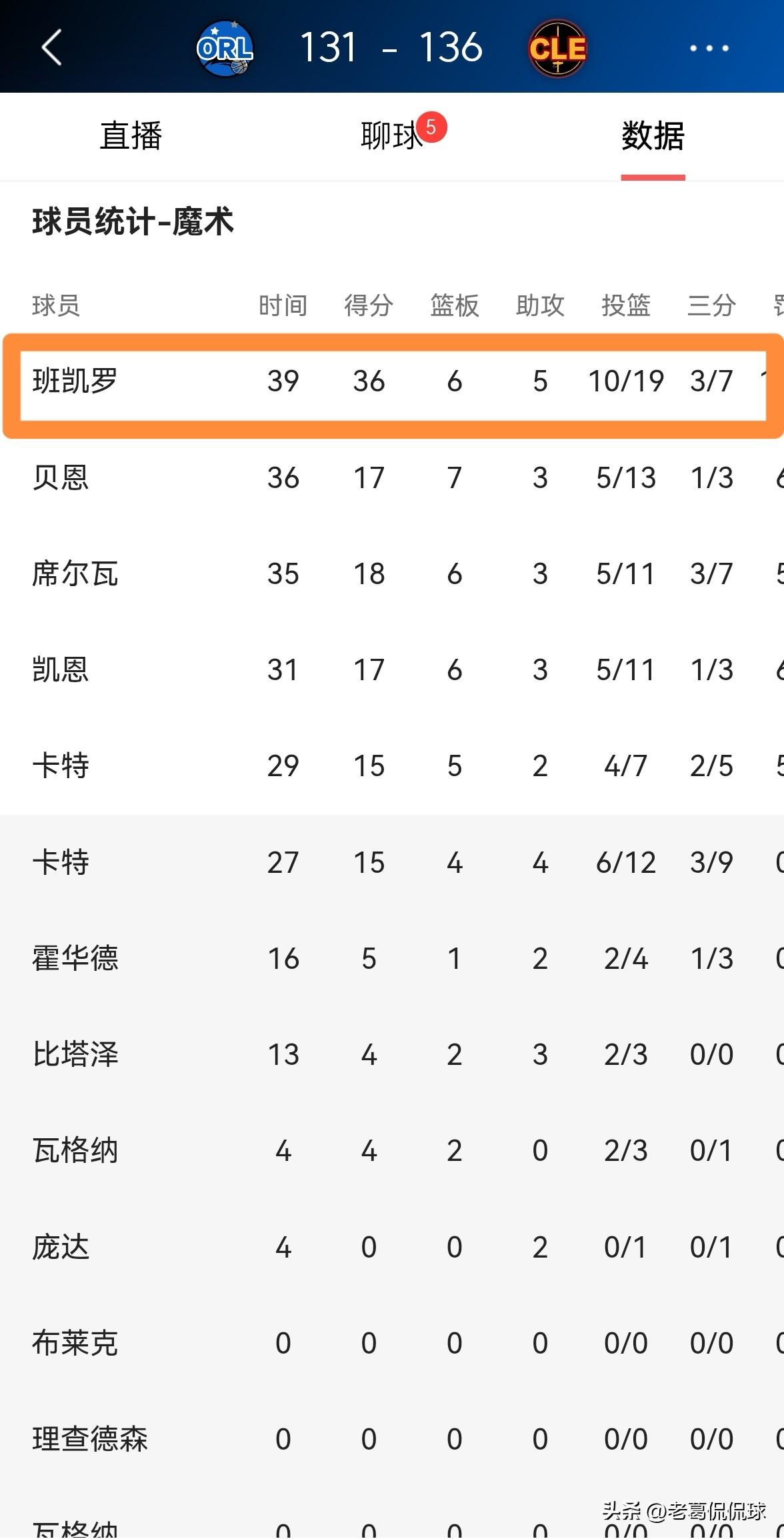 魔术当家球星班凯罗真是恨死队友贝恩了!在今天魔术客场以131:136输给骑士的比赛中,由于贝恩的低迷导致班凯罗空砍36分6篮板5助攻。 全场比赛下来,班凯罗首发出战39分钟,投篮19中10,其中三分球7中3、罚球15中13空砍36分,外加6篮板5助攻1抢断1盖帽。 反观贝恩的表现则是大失水准,我相信在比赛结束以后,当班凯罗看到贝恩的数据统计时,班凯罗必然恨死贝恩了。