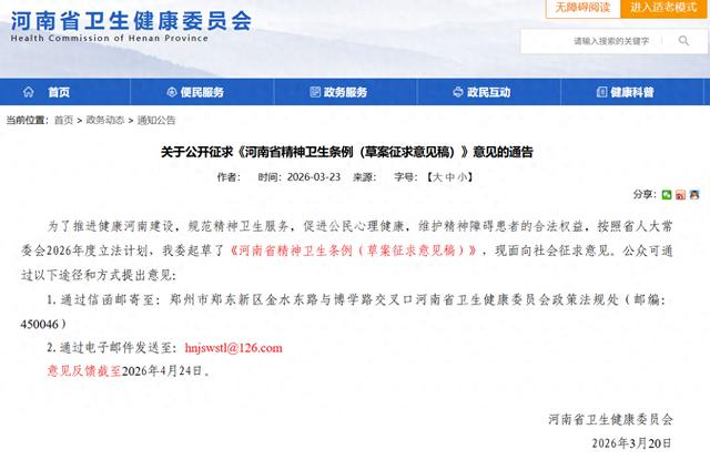 大河网讯心里烦了、堵了、不得劲了,这些事儿以后在河南,将会有更细的法律来管。近日,河南省卫生健康委起草了《河南省精神卫生条例(草案征求意见稿)》(以下简称“草案”),现在正面向社会公开征求意见。