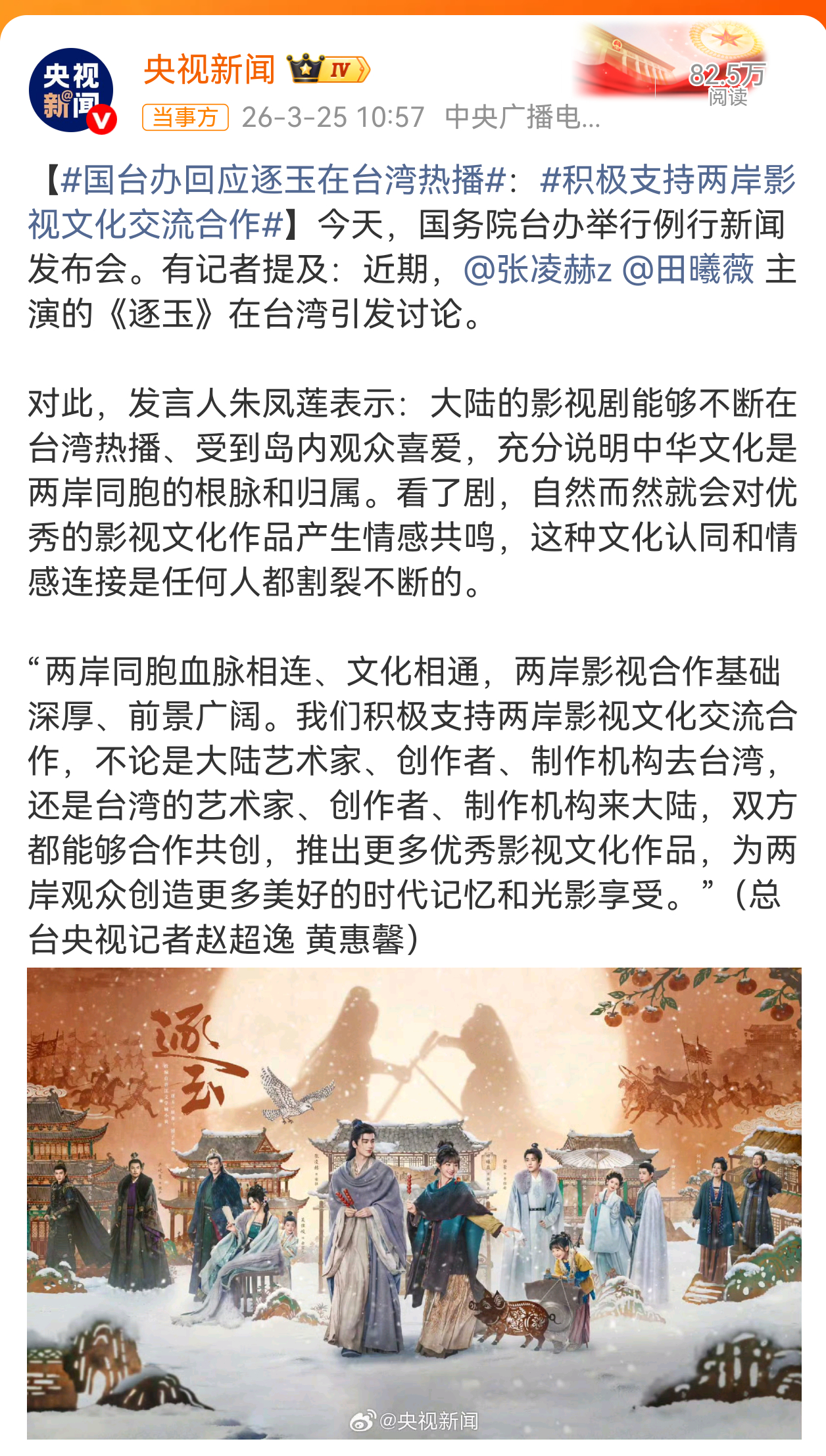 央视新闻发了逐玉排面拉满🎉央视新闻报道《逐玉》!张凌赫田曦薇主演的这部作品,获
