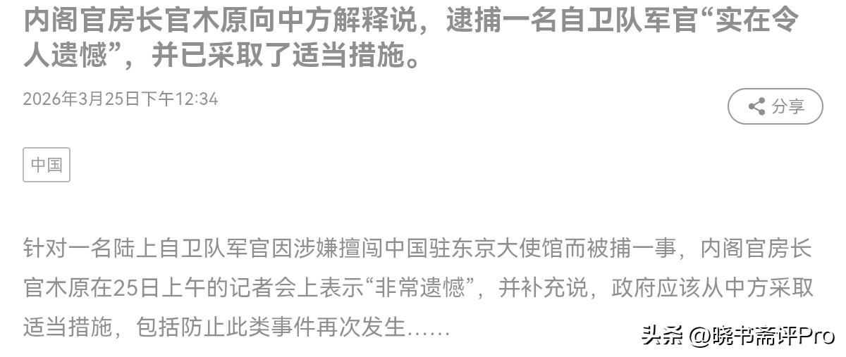 日本终于打破沉默,出来回应了!3月25日,根据日媒报道,日本内阁官房长官木原在25日上午记者会上表示,对于自卫队军官持刀闯入中国大使馆一事,我方“非常遗憾”,政府应从中吸取教训,包括防止此类事件再次发生。我方已经向中方解释称,相关事件“实在令人遗憾”。 对于日本的这一回应,我们怎么看呢?说实话,从好的方面理解,这说明日本对于我们的关切是重视的,最起码是直面了相关问题。但是,话又说回来,日本虽然开始面对问题,但是诚意明显不足,且有避重就轻之嫌。日本的回应是“非常遗憾”。问题是,日本不应该就此次事郑重致歉,并承诺追责吗? 再者,日本方面表示,“从中吸取教训、防止再发生”,问题是这样的事件真的只是一起普通的偶发事件吗?该军官到底出于什么样的动机,是在什么样的背景下硬闯中国大使馆,日本不应该好好交代,调查吗?很显然,日本看似在解决问题,实则是妄图大事化小,小事化了,缺乏诚意。