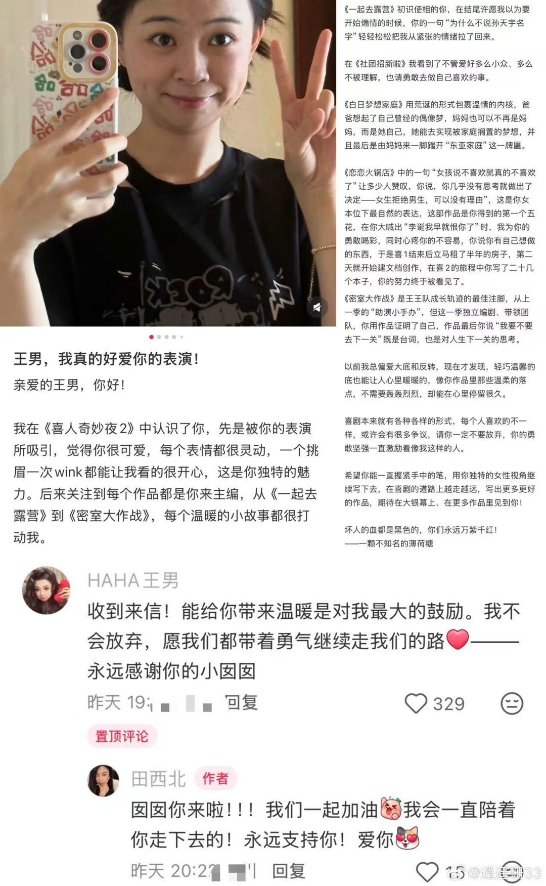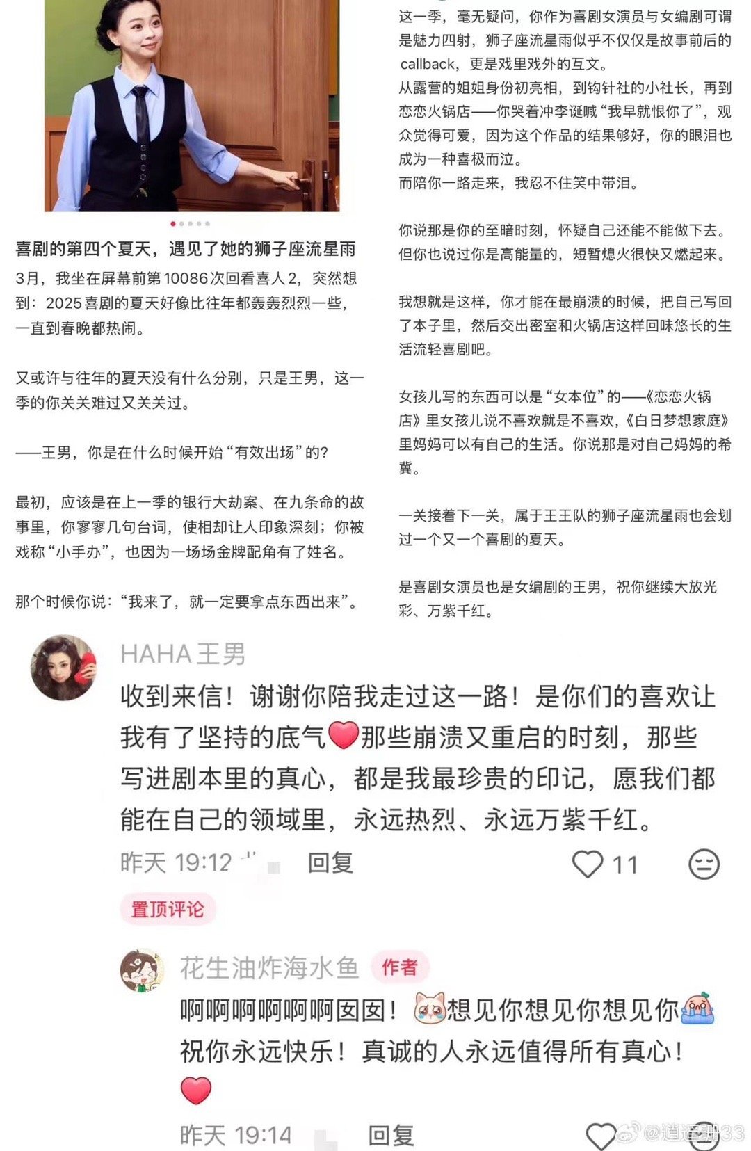女喜剧人连回6条粉丝来信你怎么知道女喜剧人回了我的信 王男、李逗逗、房主任,这三个名字放在一起,就是《脱口秀和Ta的朋友们》和《喜人奇妙夜》里最亮的那束光。新娘李逗逗纠结合影站位的样子,露营姐姐王男一亮相就惊艳全场的样子,房主任“出走的决心”里那股劲儿,全在观众心里种下了喜剧的种子。