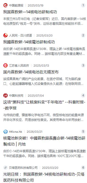 现在该轮到老美摸着中国过河了,中国搞了个大动静,C-14核电池问世了。这东西可不是核电站,而是真正的电池,靠碳-14来供能。碳-14的半衰期有5730年,意思是这电池理论上能用几千年不停歇。想想看,几千年都不用换电池,航天器、医疗设备、深海探测、偏远监测站,全都能用上,这不厉害吗? 麻烦看官老爷们右上角点击一下“关注”,既方便您进行讨论和分享,又能给您带来更多优质的内容,感谢您的支持! 现在该轮到老美摸着中国过河了。以前总说我们要追赶西方技术,可这回,咱们在能源领域搞出的这个大动静,真得让那些科技强国反过来仔细研究研究咱们的操作了。 就在2025年3月,国内首款碳-14核电池“烛龙一号”在江苏无锡和甘肃兰州两地同步亮相。这可不是什么核电站的缩小版,而是一种真正意义上能装进设备里、靠放射性衰变自己发电的微型电池 。 这玩意的核心亮点就在于它的“燃料”——碳-14。学过化学的都知道,这东西的半衰期长达5730年。翻译成大白话就是,这块电池的能量才刚消耗一半,时间就已经过去了五千年。理论上讲,这电池要是没物理损坏,能给设备供几千年的电,真正做到“一次装机,终身不用管” 。 当然,有人一听“核电池”心里就发怵,担心身边揣着个“小核弹”。这点其实大可放心,它跟核电站那种重污染的裂变反应完全是两码事。这种电池内部没有剧烈的核反应,也没有重金属和腐蚀性化学物质,就算把它丢在那,也不会有热失控或者化学毒性的风险,安全系数比咱们天天揣兜里的锂电池还要高 。 这技术最牛的地方,在于它解决了咱们以前想都不敢想的难题。比如给航天器用,咱们的深空探测器以后不用再担心太阳能板照不到太阳;给医疗用,心脏起搏器要是装上它,患者这辈子都不用再开刀换电池了;还有深海监测站、南极无人值守的气象站,这种需要长时间运行又没法维护的地方,简直就是为它量身定做的 。 其实为了做成这块电池,科研团队没少下苦功夫。以前这类电池最大的瓶颈是能量转换效率太低,发出的电不够用。这次西北师范大学和无锡贝塔医药的团队联手,不仅攻克了高比活度碳-14的制备难题,还让能量转换效率突破了8%,成功驱动了蓝牙芯片和LED灯工作 。 在发布会上,研发人员展示了一个细节:搭载“烛龙一号”的LED灯已经连续闪烁了近4个月,累计超过了35000次脉冲。虽然它现在的输出功率还只在毫瓦级,但对于传感器或者时钟芯片这种微功耗设备来说,这已经是绰绰有余的“永久能源”了 。 放眼全球,其实不光咱们在搞核电池,英国、韩国、美国也都有类似的研究。但咱们这次厉害的地方在于,从核心的碳-14放射源材料,到关键的碳化硅换能器件,全都是自己造的,拥有完全自主知识产权,没被外人卡脖子 。 而且这电池的适应能力极强,不管是零下100摄氏度的月球极寒环境,还是200摄氏度的地底深处,它都能照常工作,50年内的性能衰减还不到5%。这种稳定性,让它在军工、航天、深海探测这些战略领域,有着无可替代的价值 。 现在,这个“烛龙一号”还只是个工程样机,但它的出现已经标志着咱们在微型核电池领域,从过去的追赶者变成了引领者。以前是咱们看国外有什么新鲜技术,想办法去模仿;以后可能就是国外看着咱们的这个“千年电池”,琢磨着该怎么跟上脚步了 。 据研发团队透露,“烛龙二号”的研发也已经提上了日程,未来它的功率会更高,体积会更小,真正走进寻常百姓家,比如给物联网传感器供能,甚至给未来的脑机接口设备提供终身能源 。 咱们以前总觉得核能高高在上,要么用来发电,要么造武器。但这次,咱们把这股强大的能量压缩成了一枚小小的纽扣,让它安全、安静地去服务那些最需要长续航的地方。这种技术变现的能力,确实值得骄傲 。 回过头看,从当年的“两弹一星”到现在的微型核电池,咱们在核技术应用这条路上走得越来越稳,也越来越有想象力。这一次,该轮到别人摸着咱们的石头过河了。
