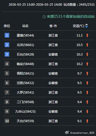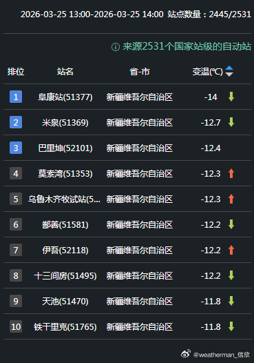 另外今天因为雨过天晴,华东多地升温明显。浙江和安徽站点包揽了14时升温榜前十,浙江建德升11.1℃、安徽石台升10.3℃为各自省份14时升温最强站点。今天因为冷空气影响,新疆包揽降温榜前十,阜康降14℃排名第一。