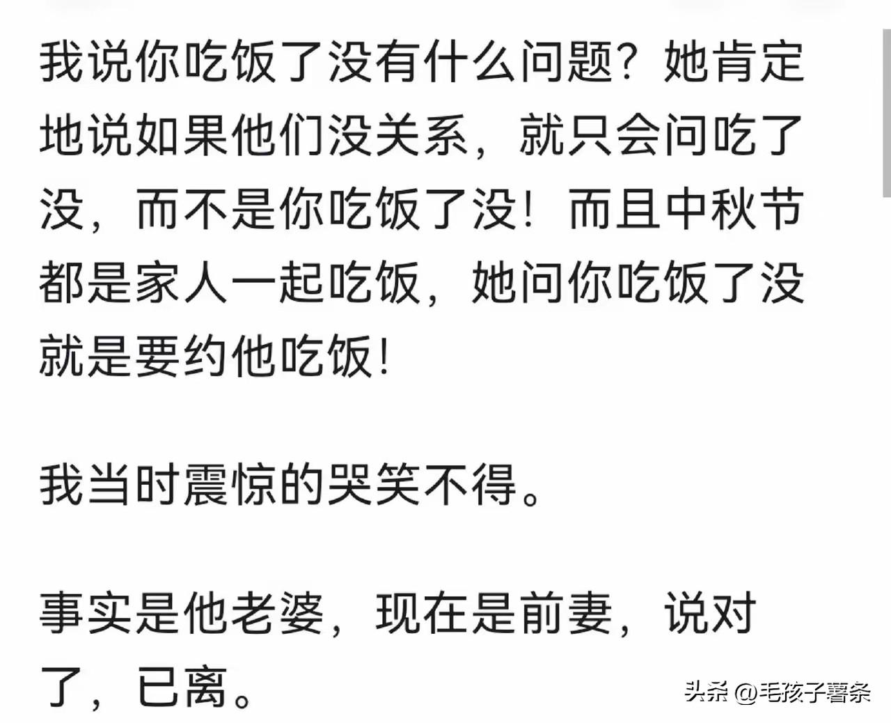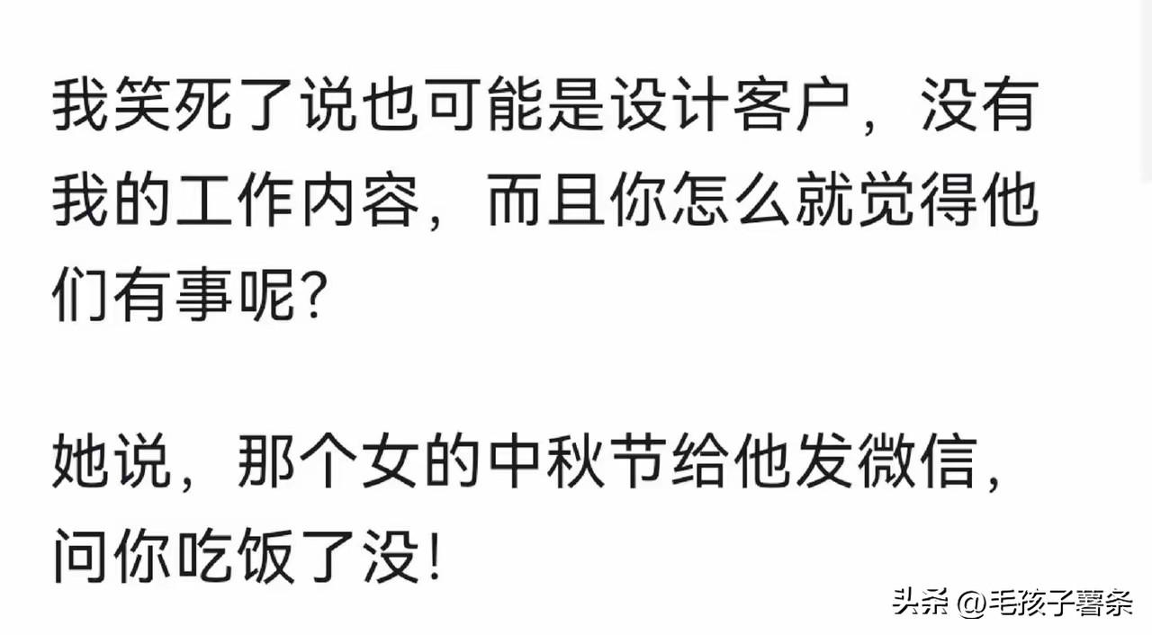 就凭微信上发了:你吃饭了吗?妻子就断定丈夫有外遇了,看似啼笑皆非的事情,果然就让妻子说着了。 女子哭哭啼啼的说丈夫出轨了,而且还指名道姓就是丈夫的一个女客户,同事们都很震惊,觉得女子有点神经质。 女子的根据是,中秋节的时候,女客户给她丈夫发个微信:你吃饭了吗?女子说这很不正常,正常的是你吃了吗?而不是你吃饭了吗,显然是想和丈夫出去吃饭。 看似没有道理、匪夷所思的事情,却让妻子说中了,是巧合还是妻子太敏感? 其实仔细想想妻子说的有道理,如果是工作关系,寒暄的时候应该说:你吃了吗?如果很熟了,关系不一般,问你吃饭了吗?确实像是在约饭。 图自网络侵必删