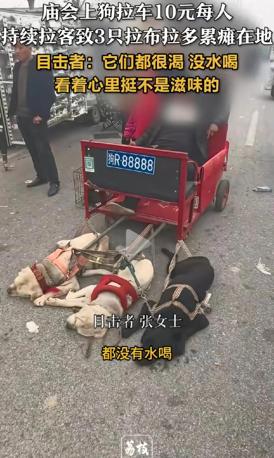 非坐不可?河南南阳,一个庙会上三只拉布拉多犬被用来拉车揽客,10块钱一位。没成想一名130斤的妇女带着两个孩子坐上车,连人带车总重超过200斤。狗拉车艰难绕场一圈后,直接累瘫在地,四肢趴开,动弹不得。有目击者说,狗狗们明明很渴,却一口水都没喝上。 庙会上,人多、嘈杂,气温也不低。涉事狗车上挂着一块醒目的牌子,写着“狗R88888”号牌,花10块钱就能体验一次。 三只拉布拉多被套上绳子和车,负责拉着游客在场地里转圈。 拉布拉多是中型犬,体力确实比小型犬好,但也经不起这样长时间、重负荷的折腾。 从视频里能看见,狗拉的车是那种简易的铁架子车,坐一个人就已经不轻了,可车上往往还坐着大人,有的甚至是两个小孩一起上。一趟又一趟,没有休息。 到了最后,三只狗直接趴在地上,怎么拽都不起来。旁边的人还在招呼“10块钱一位,便宜好玩”,根本不管狗已经累到虚脱。 狗不会说话,不会喊累,不会投诉,它们只能用瘫倒、趴下、喘粗气来告诉所有人:我真的拉不动了。 目击者张女士说,狗狗们当时明显很渴,却没人给它们喝水,看着心里特别不是滋味。她觉得赚钱的方式有很多,没必要让动物这样受罪。 有网友说这就是变相的虐待动物,狗狗又不是赚钱的工具,凭什么被这么折腾,都呼吁赶紧停了这种狗拉车项目。 也有网友提出不同观点,说一些爱护动物的人太双标了,农家还用牛犁地呢,怎么不说这个。 在我看来,这两种情况根本不是一回事! 农家的耕牛是传统农耕用的,农户们大多都会好好善待耕牛,不会往死里折腾。 可这庙会上的狗狗,是被当成游乐工具,硬拉着超标的重量连休息都没有,甚至渴了都没水喝,拉布拉多本就是温顺的伴侣犬,哪经得起这样的高强度折腾? 它们不会说话,累了渴了只能自己扛,瘫在地上的样子,谁看了能不心软? 为了赚那10块钱,不顾狗狗的死活,这样的赚钱方式,真的太没底线了! 其实这件事,说到底是让大家重新思考动物保护和合理使用动物的边界在哪。 牛犁地是顺应农事的合理使用,而且背后是农户的善待,可把伴侣犬当苦力,为了牟利过度折腾,让动物承受不该有的痛苦,这就是赤裸裸的虐待,根本谈不上什么“合理使用”。 爱护动物从来都不是什么双标,而是生而为人对生命最基本的尊重。 希望这件事能被相关部门看到,好好管管这类伤害动物的游乐项目,也希望涉事方能站出来给个说法。 动物不是我们博取利益、寻欢作乐的工具,别让人类的快乐,建立在动物的痛苦之上,每一个小生命,都值得被温柔对待。 狗拉车10元每人 3只拉布拉多累瘫