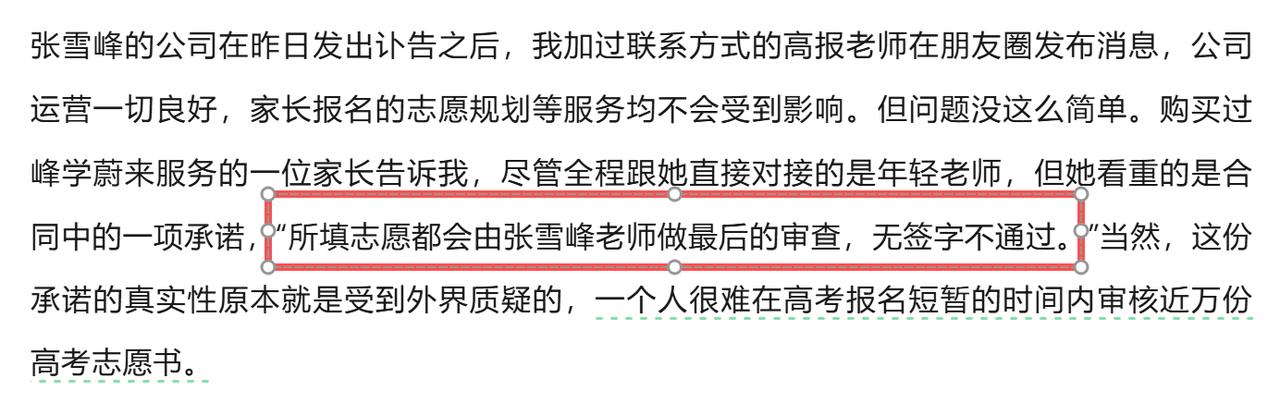 看了高考家长说的话,终于知道,张雪峰为什么会那么累了。 注意看图四红框里的内容。 在张雪峰的公司,报名高考志愿规划,负责对接的是年轻老师,但是每一份志愿规划,最终都要张雪峰亲自审核签字。 事实上,考生的家长看重的,也只有张雪峰本人。 试想一下,每年高考报志愿期间,那短短的30天左右,张雪峰本人需要审核多少份志愿?有人推测,至少在一万份以上。 按30天算,那就是一天300多份。假如一天工作10小时,那就是每小时看30多份,相当于两个分钟看一份。 很显然,这是不可能的。所以,每天工作时间,就不可能只有10个小时。 工作已经很累了,还要抽出时间跑步,身体确实吃不消。
