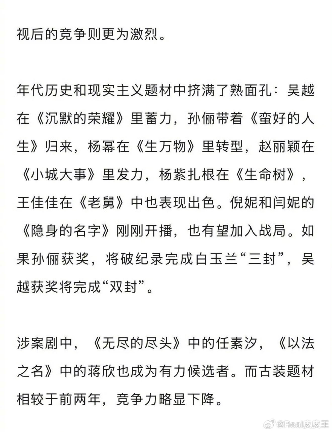 白玉兰造势进入白热化了。其实业内预测的这份视后入围名单,跟网友预测的差不多,集中