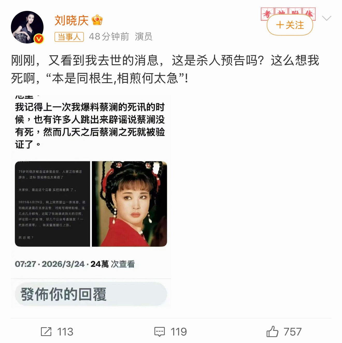 刘晓庆这是杀人预告吗造谣者闲的没事干多关心关心自己吧,我们庆奶好着呢!都来向刘晓庆学习就不死