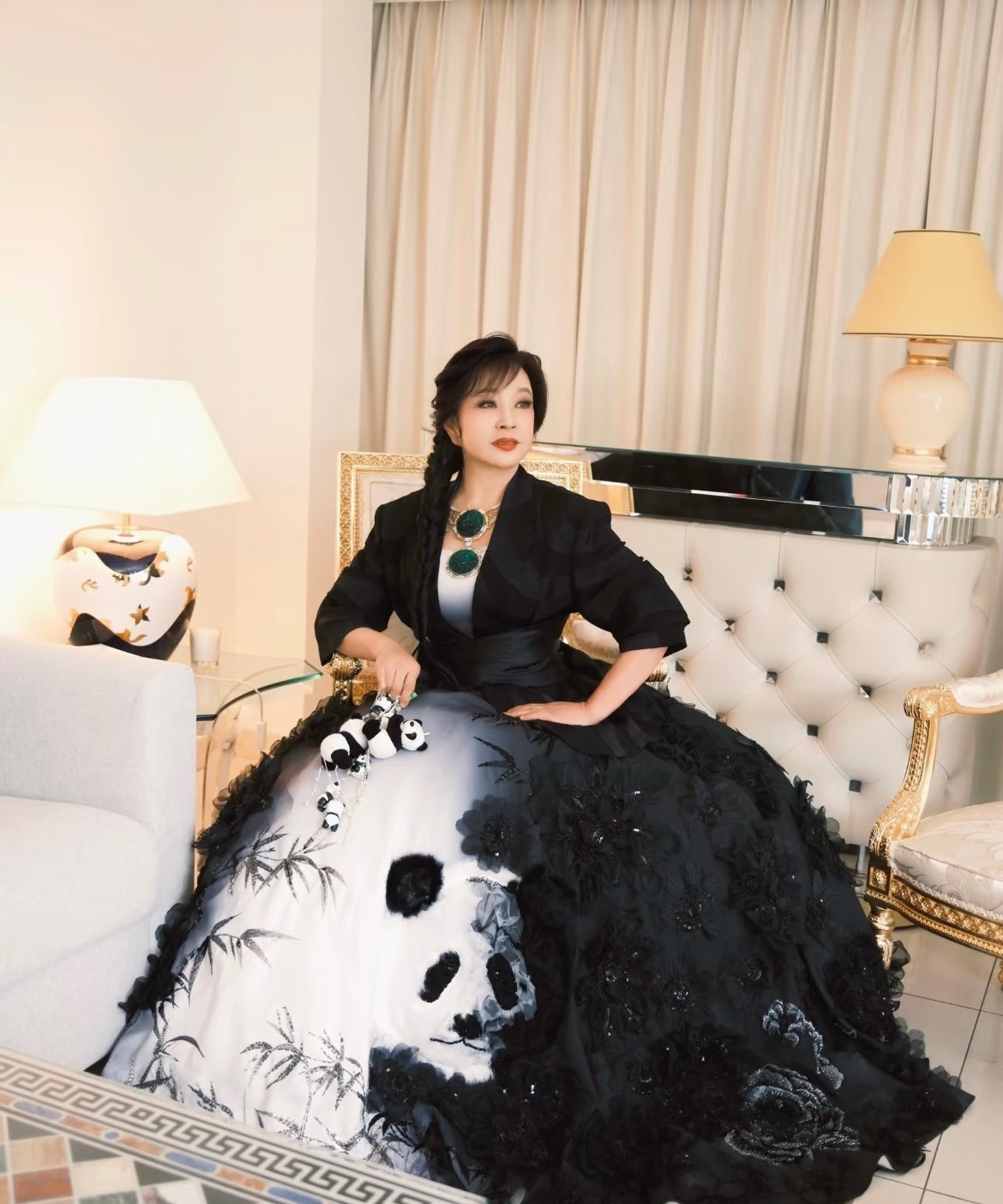 75岁的刘晓庆现身三亚免税店,真是把冻龄俩字演活了她穿了一件黑白树枝纹的西装外