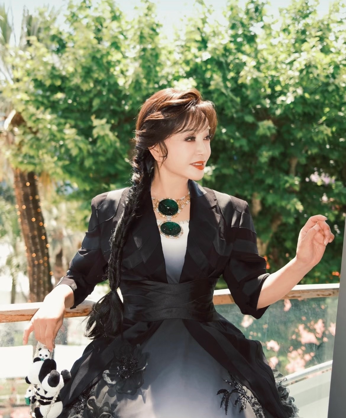 75岁演员刘晓庆现身重庆戴家巷一身中式修身装扮亮相街头,头扎朝天辫、发髻旁簪戴
