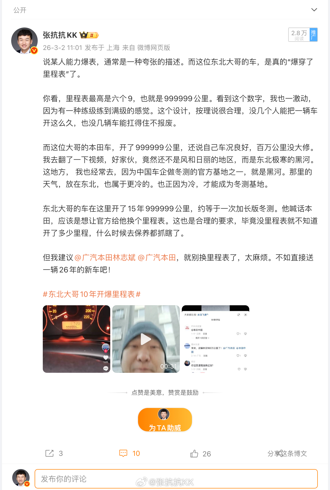 我还有点欣慰。因为我当时就发微博说,别折腾换里程表了,不如直接送一辆新车吧。还专门艾特了广汽本田林志斌。现在回头看,广本这次确实把这事接住了,而且接得挺完整。