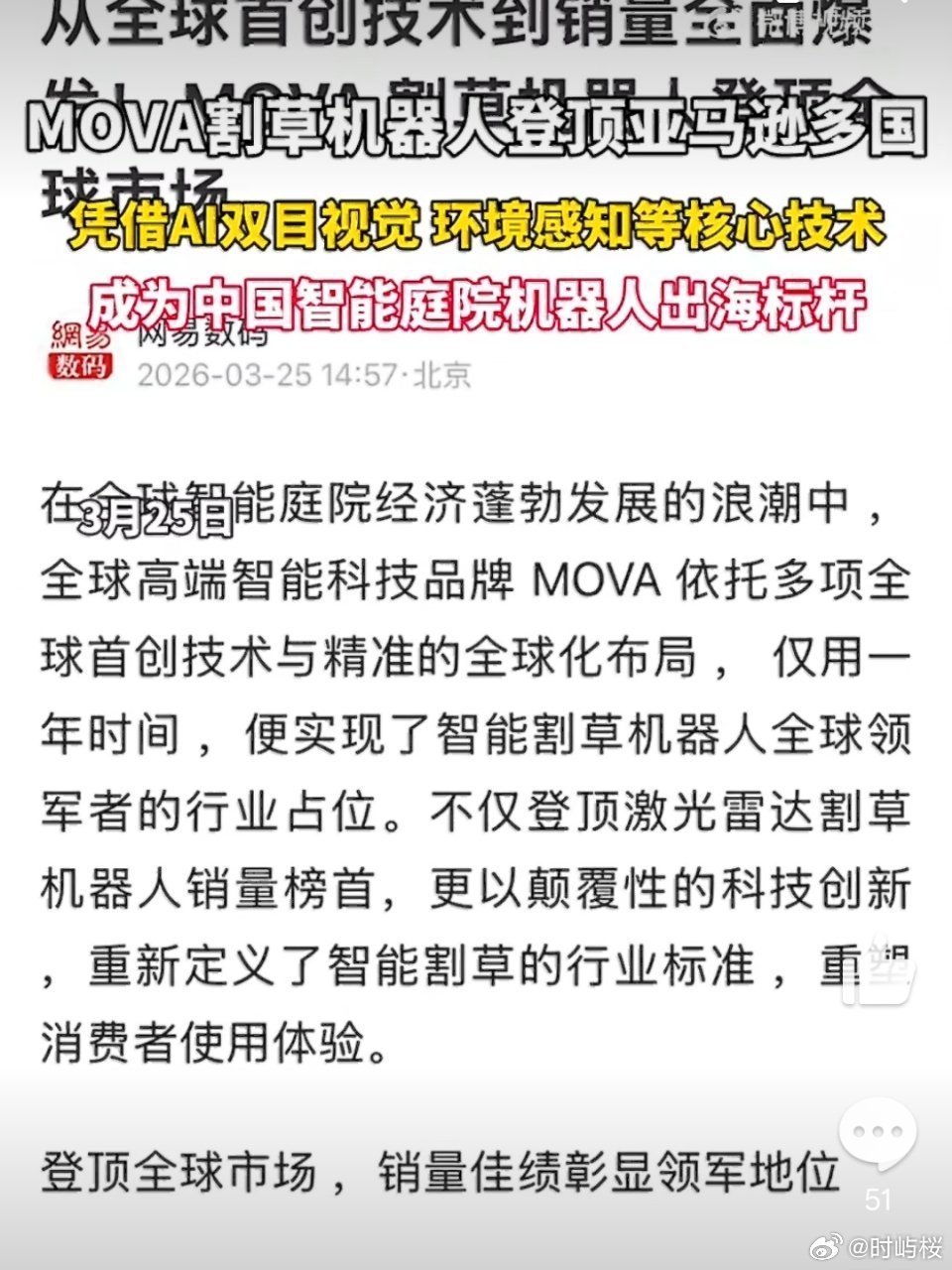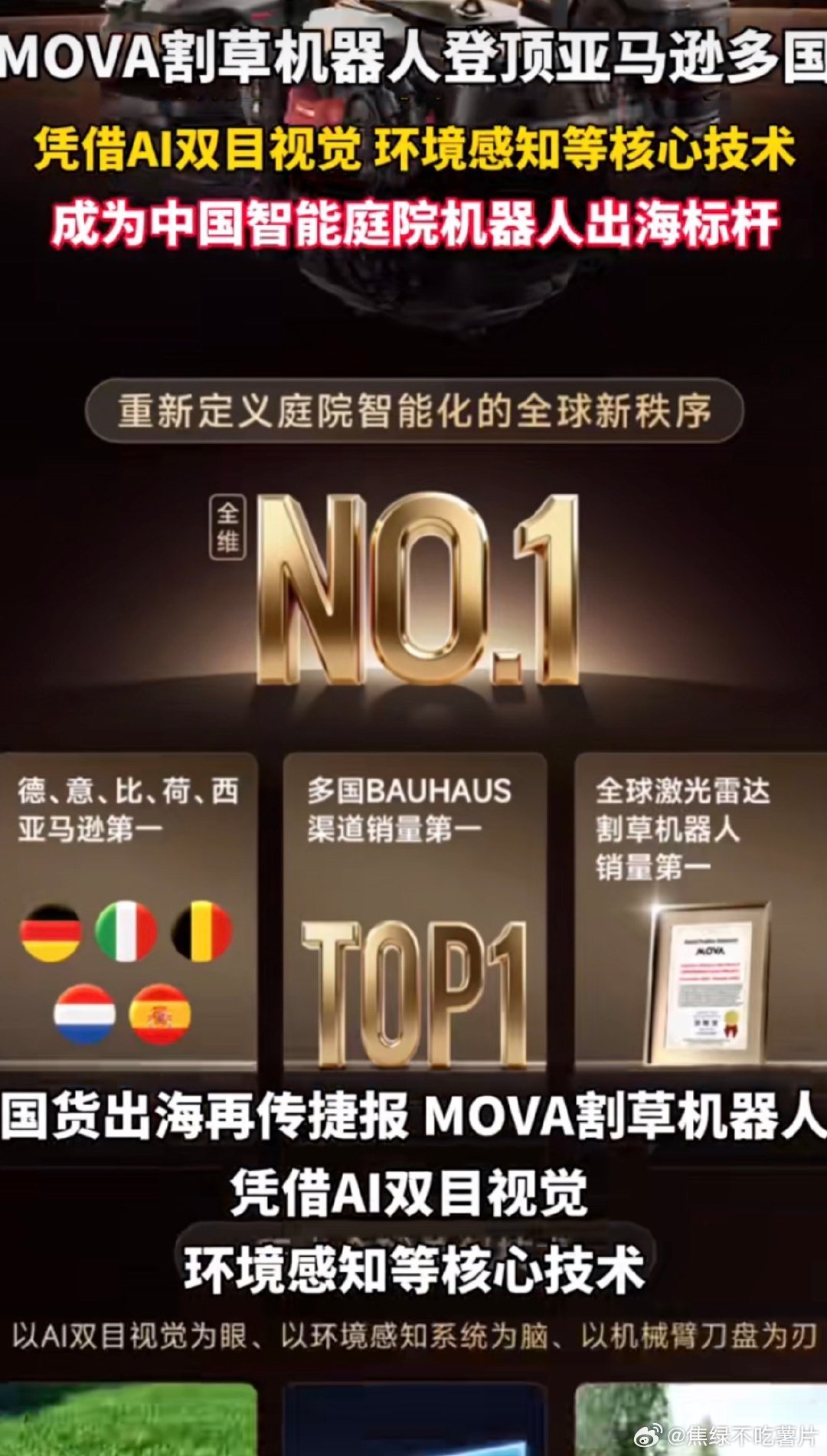 中国智造割草机器人全球销量连续登顶MOVA以AI双目视觉和激光雷达为核心优势,一
