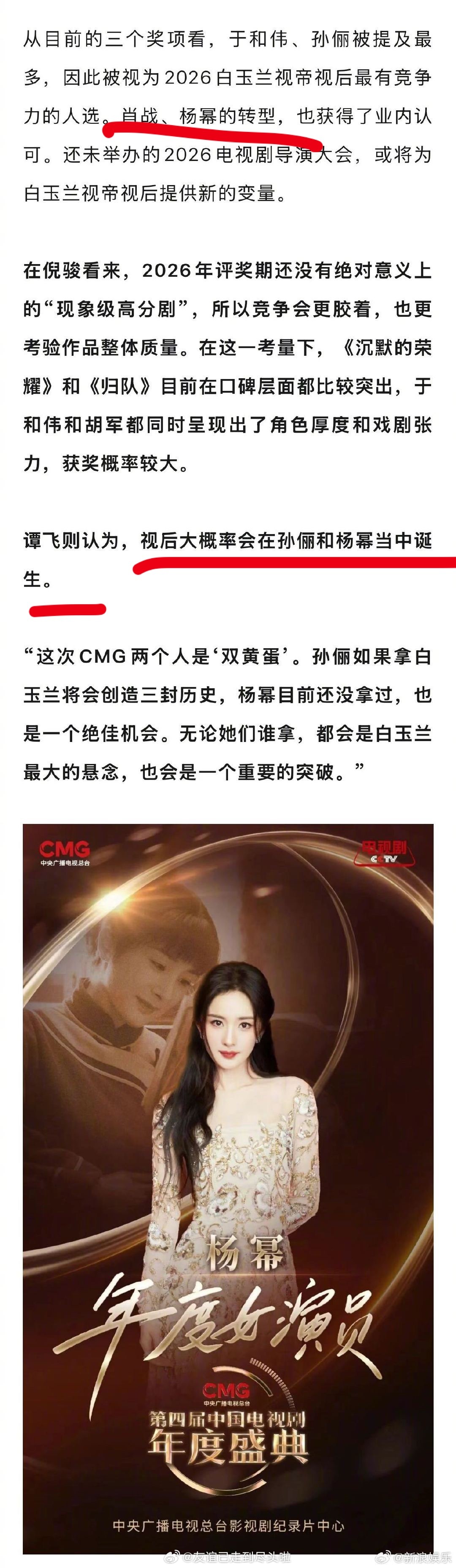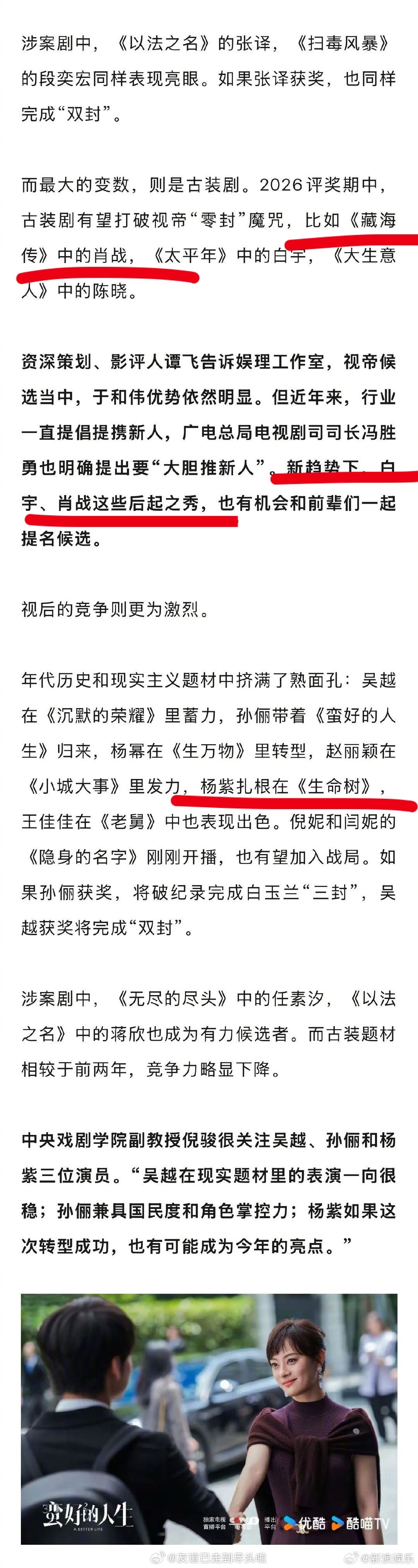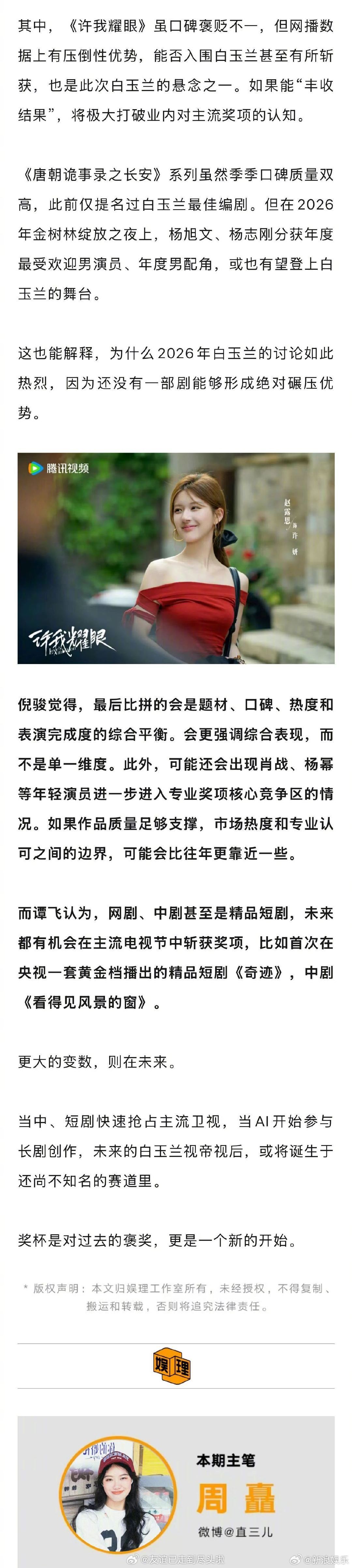 业内几个对这次白玉兰的分析:从题材口碑热度来说,肖战、杨幂的转型很受认可,也分别得到了总台、SMG、品质盛典的肯定赵露思的《许我耀眼》能不能入围也是悬念之一杨紫是否得奖是今年亮点业内谈肖战杨紫白玉兰得奖几率