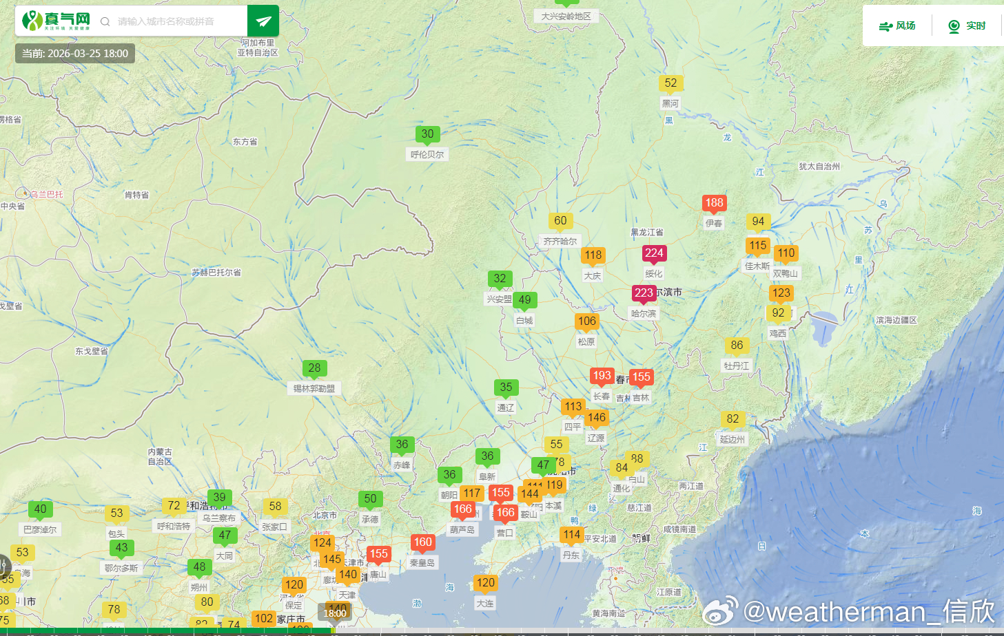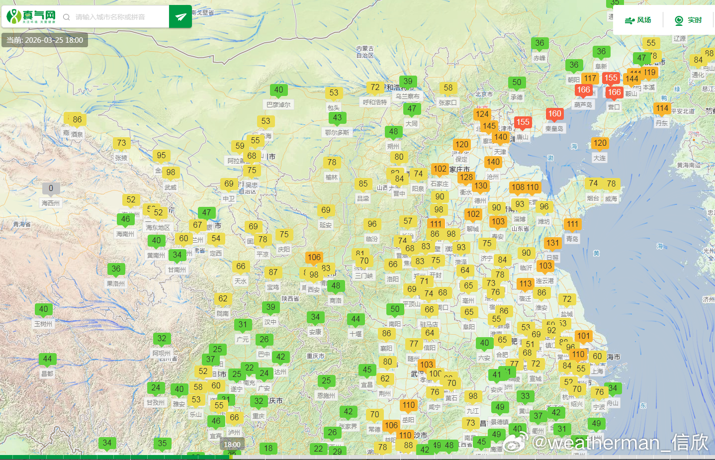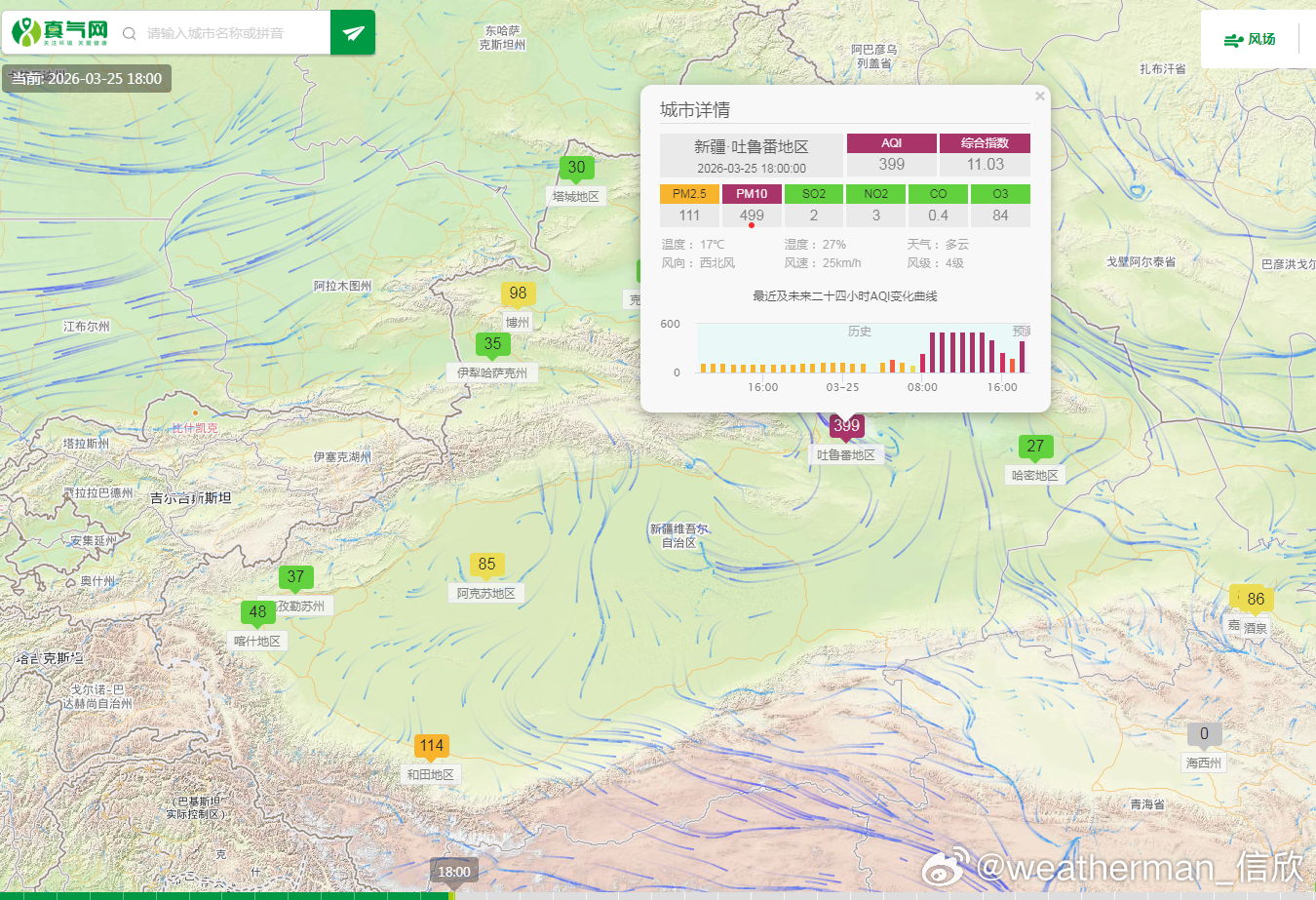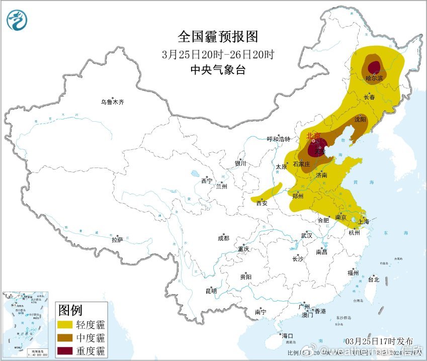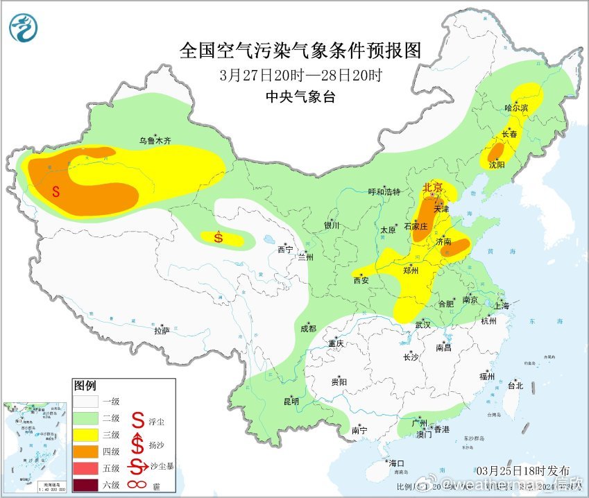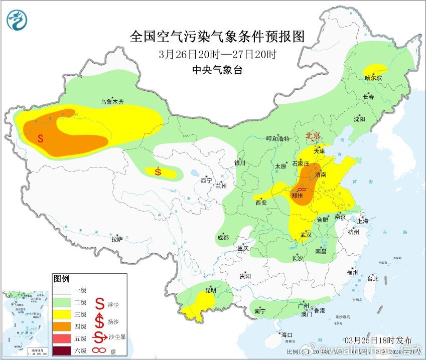 【雾 霾 沙尘】从今天18时空气质量看,东北西部和华北黄淮的污染减轻,霾暂时减弱。新疆吐鲁番因为冷空气的大风影响,导致沙尘污染。25日夜间-26日,东北华北黄淮江淮等地的大气扩散条件不利,可能还有轻至中度霾,局地重度霾。另外新疆东部和南部、内蒙古西部等地的部分地区有扬沙或浮尘天气,新疆南部局地有沙尘暴。