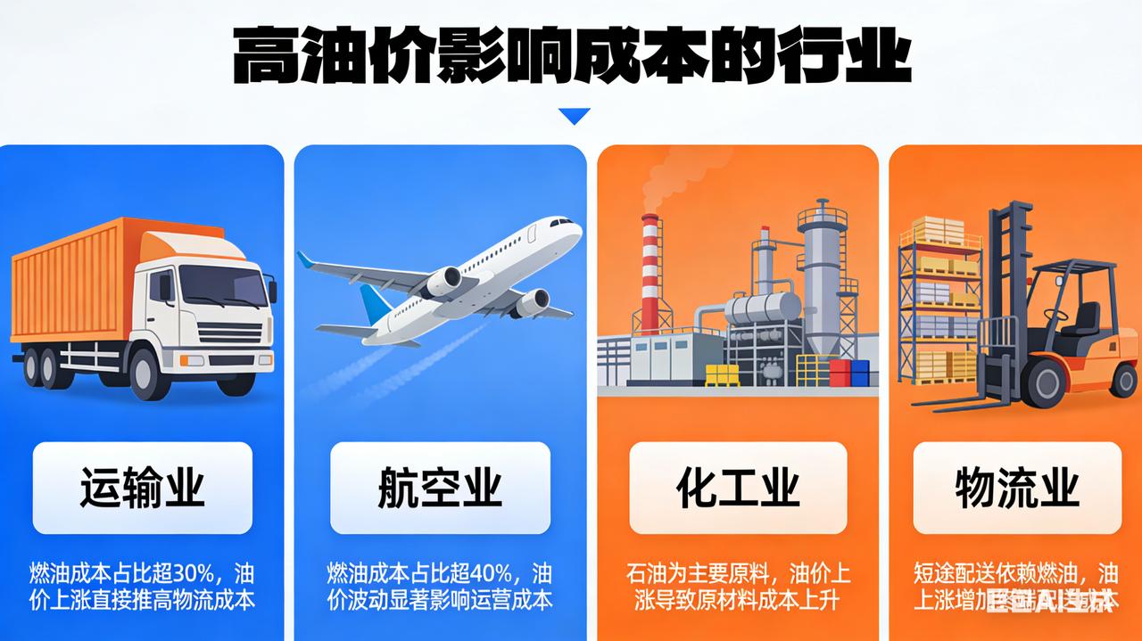 交通运输:航空、海运、公路货运及物流企业首当其冲,燃油常占运营成本的三到四成,油价上涨直接挤压利润,并会传导至快递费、出行票价。 石化与化工:石油是塑料、化纤、化肥等的基础原料,成本上涨会沿产业链传导至纺织、家电、建筑包装等行业。 农业:成本压力来自两方面,一是农用柴油(耕作、运输)涨价,二是化肥(以天然气/石油为原料)涨价,最终推高粮价。 制造业:汽车、机械、电子产品等依赖塑料、橡胶及高耗能金属(铝、铜冶炼耗电高),面临原材料与能源成本双重上涨。 建筑业:沥青(道路)、塑料管材、化学涂料及重型机械油耗成本均受油价影响。 消费服务:生鲜电商、外卖等依赖冷链物流的平台配送成本上升,最终可能转嫁给消费者。 简言之,油价上涨是典型成本推动型通胀的来源,所有依赖“运输”和“石油衍生品”的行业都会承压。
