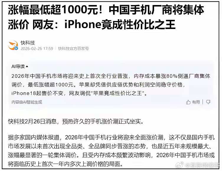 但是呢,华为还有千元机,确实出乎我的意料之外,你看现在全球手机市场是个什么情况,存储芯片价格涨得离谱,根据IDC的数据,2026年全球智能手机出货量预计要降12.9%,但平均售价反而涨了14%,达到523美元的历史新高。