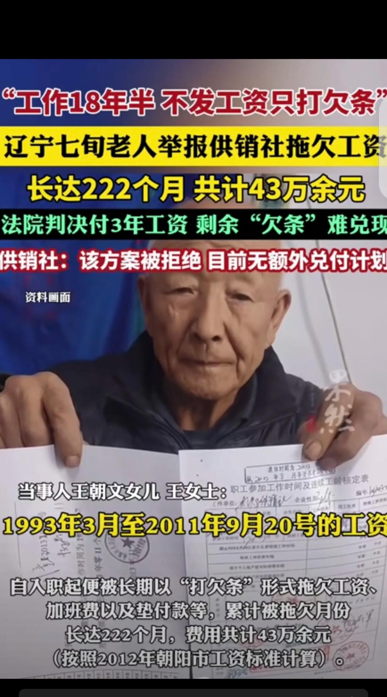 辽宁,一7旬大爷,在供销社上班18年,供销社不发工资,只打欠条,欠了222个月工资,累计43万多元,大爷一气之下把供销社告了,法院判决供销社给大爷3年工资,剩下的继续打欠条,大爷坚决不同意,就想有生之年拿回自己的辛苦钱,2026年供销社又挤牙膏一样,要给大爷3万,大爷崩溃了! 1993年,王大爷进了当地供销社。在那个年代,这可是妥妥的“铁饭碗”啊!大爷把这当成一辈子的依靠,起早贪黑,拼命工作,就想靠着这份收入,把孩子养大,给父母养老送终。 他做梦都没想到,这个“铁饭碗”,竟然是把他拖进深渊的“黑洞”! 从入职那天起,供销社发工资就不发现金,全打欠条!! 而且不光是工资,加班费、平时为了工作垫付的钱,全都拖着!! 这是什么概念? 一个劳动者,养家糊口的钱拿不到,干活还要自己倒贴钱!这日子怎么过? 王大爷一次次去找领导,对方每次都打太极:“资金紧张,再等等,有钱肯定给。” 老实人信了,这一等,就是 18年!! 18年啊! 累计欠薪 222个月,金额高达 43万多元! 这43万,是老人半辈子的汗水啊!是他和老伴的养老钱啊! 到了2010年,实在走投无路的王大爷,选择了报警,把供销社告上了法庭。 官司打了好几年,2013年二审判决下来。 虽然认定了劳动关系,但因为所谓的“改制”和“时效”问题,法院最终只判了供销社支付 3年 的工资。 剩下的 40多万,还是继续打欠条! 王大爷不服啊!他觉得自己干一天活,就该拿一天的钱,凭什么白干十几年? 他不死心,继续四处奔走申诉。 终于在2018年,相关部门协调后,确认了他18.5年的工龄! 眼看就要看到希望了,结果这核算,又成了一纸空文,迟迟没有落实。 时间来到了 2026年! 本以为老人苦尽甘来,结果供销社给出的“解决方案”,直接把大爷逼崩溃了—— 只愿意支付 3万多元!! 3万??? 面对43万的血汗钱,这不是补偿,这是羞辱!! 这就好比你辛苦种了十年的果树,结果对方只肯赔你一颗花生种子! 王大爷当场崩溃,坚决不同意。 但供销社那边却理直气壮地甩锅:“法院只判了3年,你不同意,我们也没办法啊!” 看到这里,我真的想问一句: 还有没有王法?还有没有天理? 🧑 网友热评1: 43万欠薪砍成3万,这是把老实人往死里逼啊!供销社这吃相太难看了! 👮 网友热评2: 18年的青春和汗水,就换来一摞欠条?现在的社会,还能容不下一个讨薪的老人吗? 📉 网友热评3: 什么改制、时效,都不能成为拖欠老百姓血汗钱的借口!能不能给老人一个公道! 我也想替王大爷说几句公道话: 这绝不仅仅是钱的问题,这是良心的问题! 手里攥着白纸黑字的欠条,盖着鲜红的公章,那是老人用岁月换来的凭证! 就算有历史遗留问题,就算有诉讼时效的门槛,也不能成为欺负一位70岁老人的理由! 根据《保障农民工工资支付条例》精神,欠薪本质就是拖欠劳动报酬。 当地相关部门不能再视而不见了,不能再让老实人流汗又流泪! 现在的王大爷,已经70多岁了,他耗不起,也等不起了。 希望相关部门能立刻介入,严查这笔欠薪,给老人一个痛快的、对得起良心的交代! 别让讨薪,成为一位老人晚年最后的遗憾!