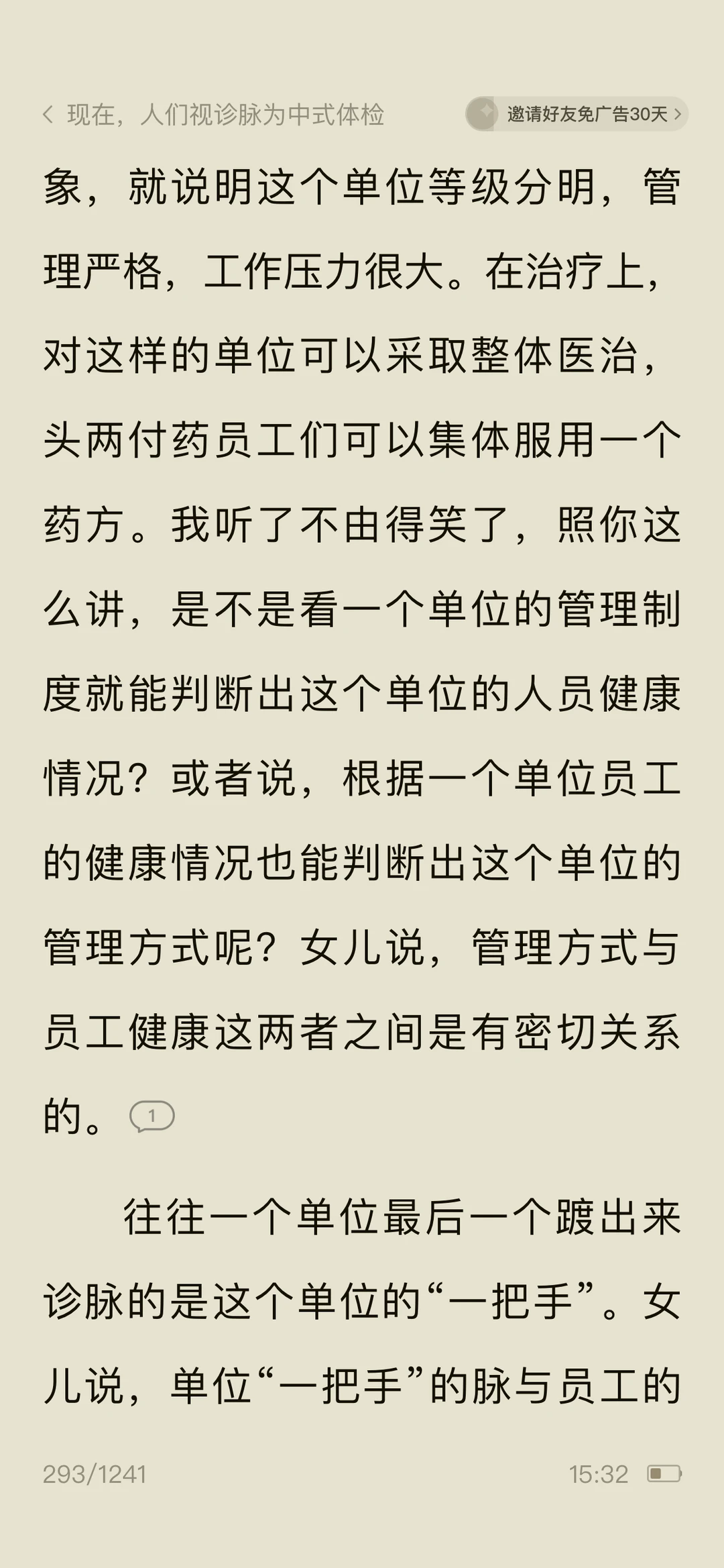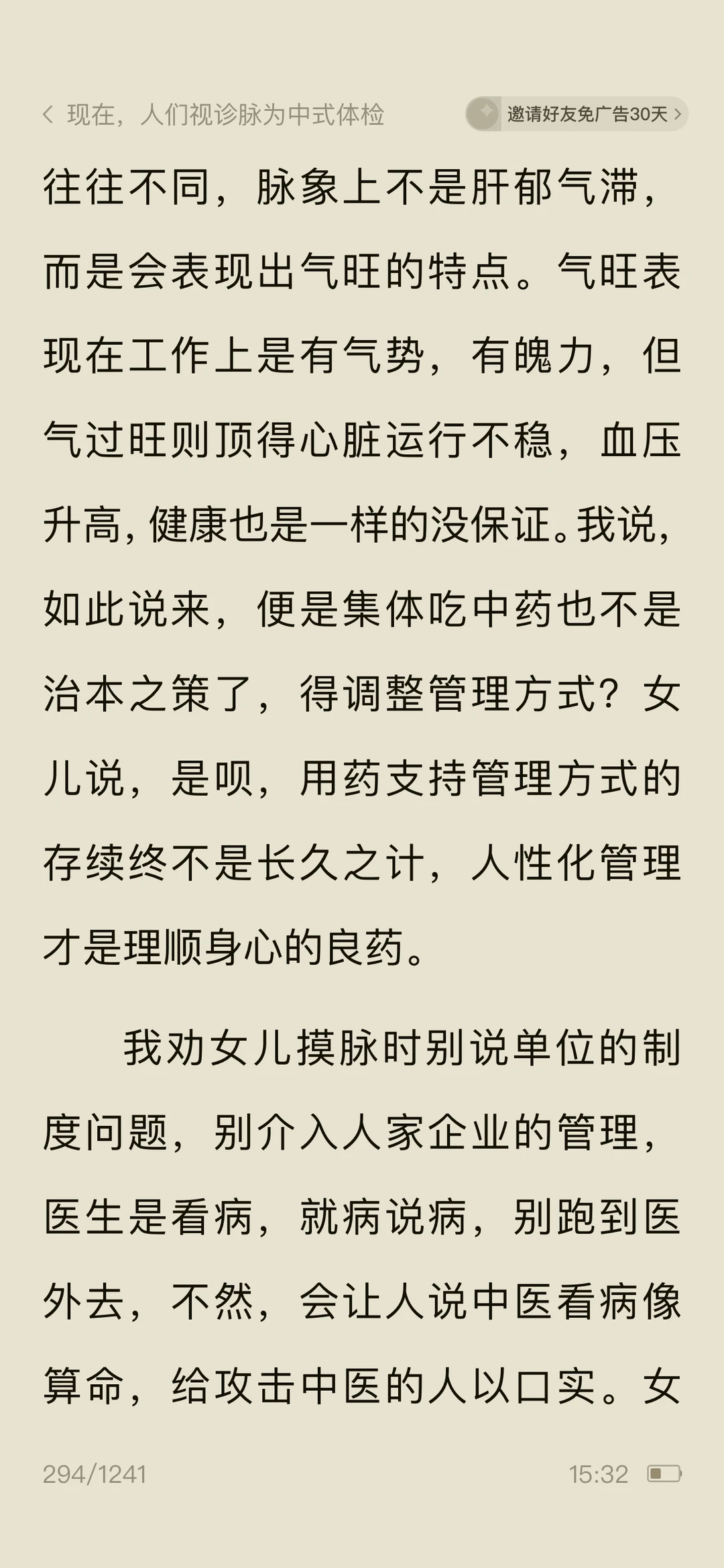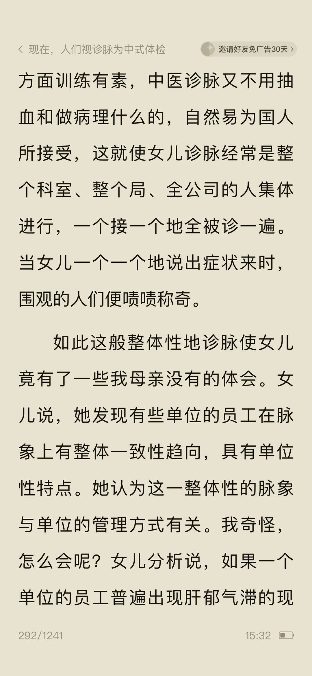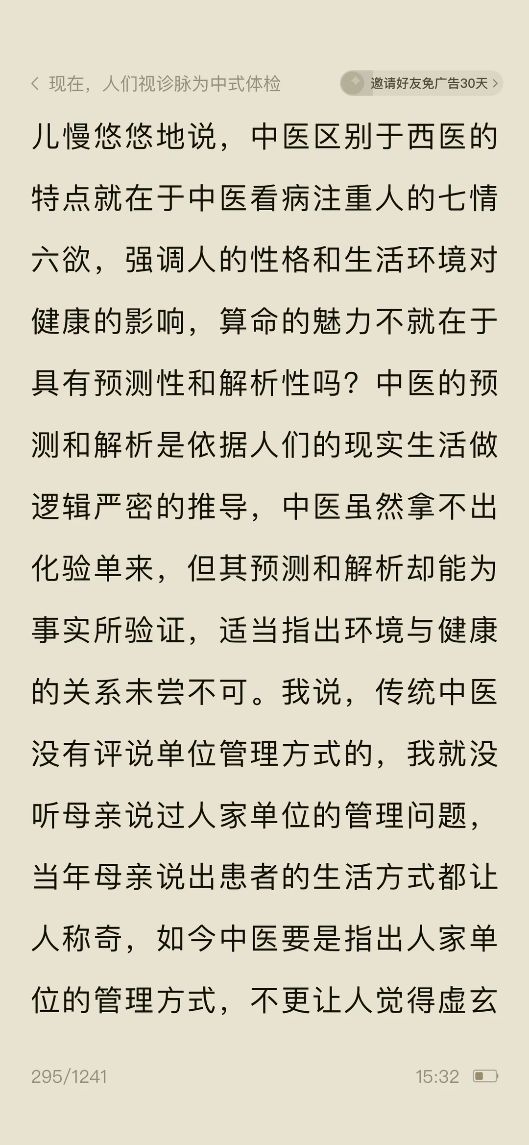 🍀看《问中医……》作者调侃脉诊很准的女儿看病就行,别“算ming”,防止落人口实,女儿说:中医看病注重人的七情六欲,强调人的性格和生活环境对健康的影响,算命的魅力不就在于具有预测性和解析。