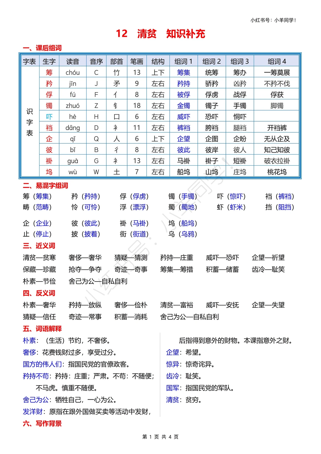 五年级下册第 12 课《清贫》的学习目标整理好啦📚 超适合语文笔记直接抄,考点重点一眼看清!