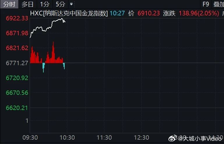 截至发稿,纳指涨1.26%,道指涨0.71%,标普500指数涨0.75%。中概股普涨,纳斯达克中国金龙指数盘中拉升,截至发稿,涨超2%。宝尊电商涨16.43%,虎牙涨6.25%,京东涨超5%。