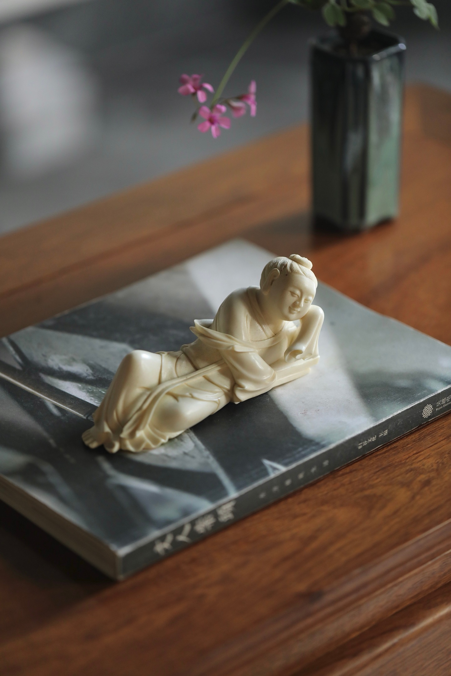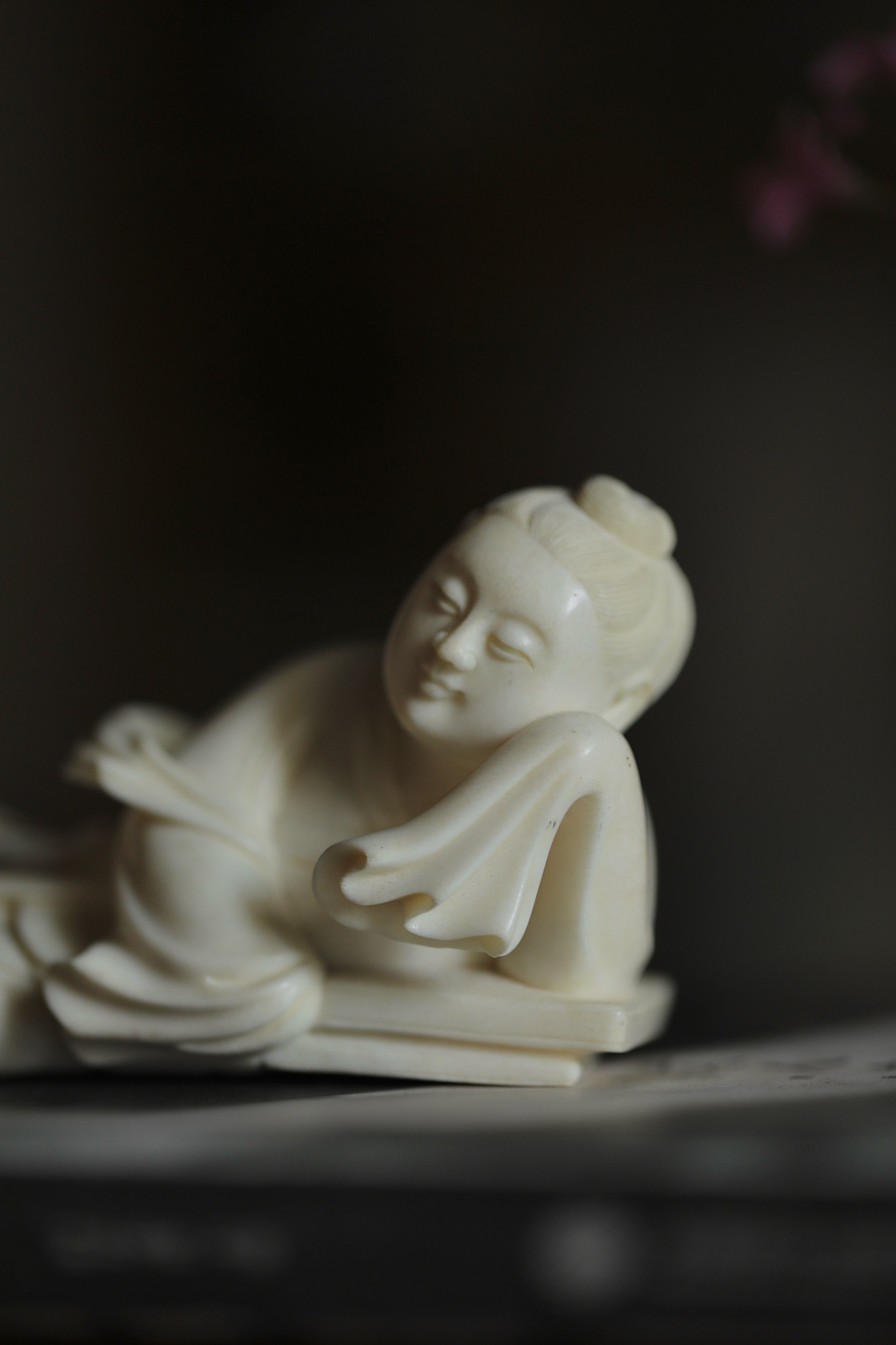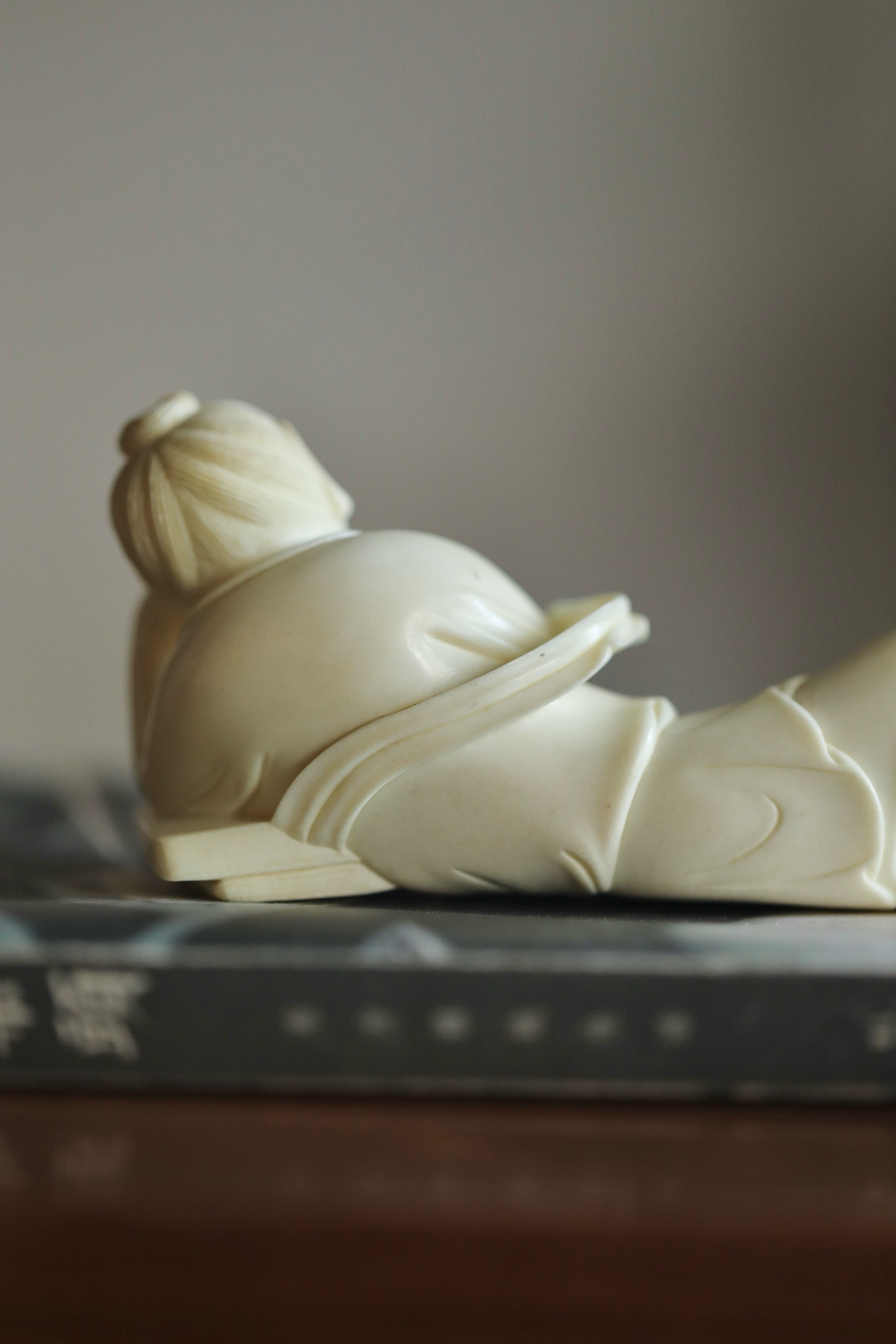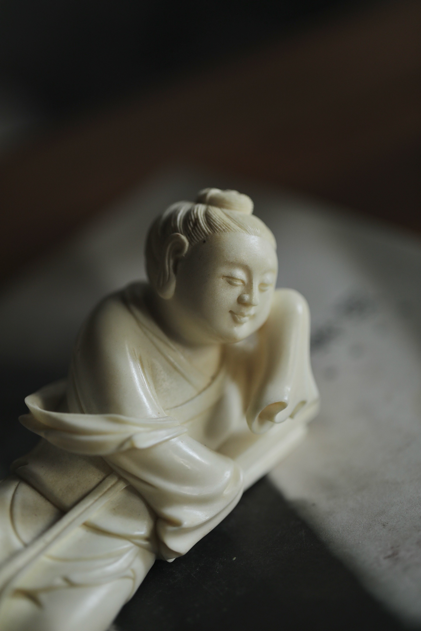 仕女侧卧伏枕,发髻高挽,衣袂垂拂,线条柔婉流畅,姿态慵懒恬和,枕下暗合镇纸之实用,文玩与陈设兼得。置于案头,如伴佳人静读,温婉娴静,涤尽尘嚣,暗合“红袖添香夜读书”之文人雅意。