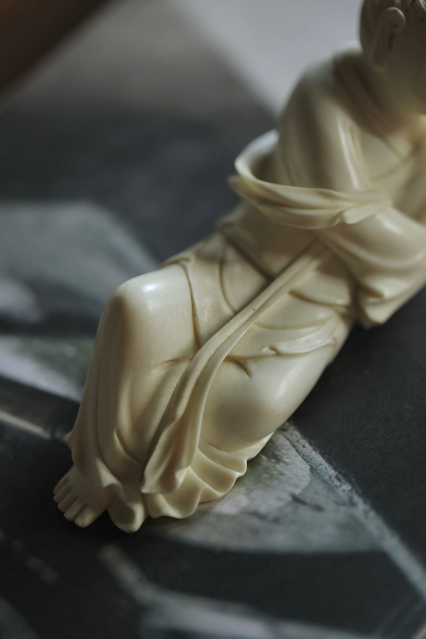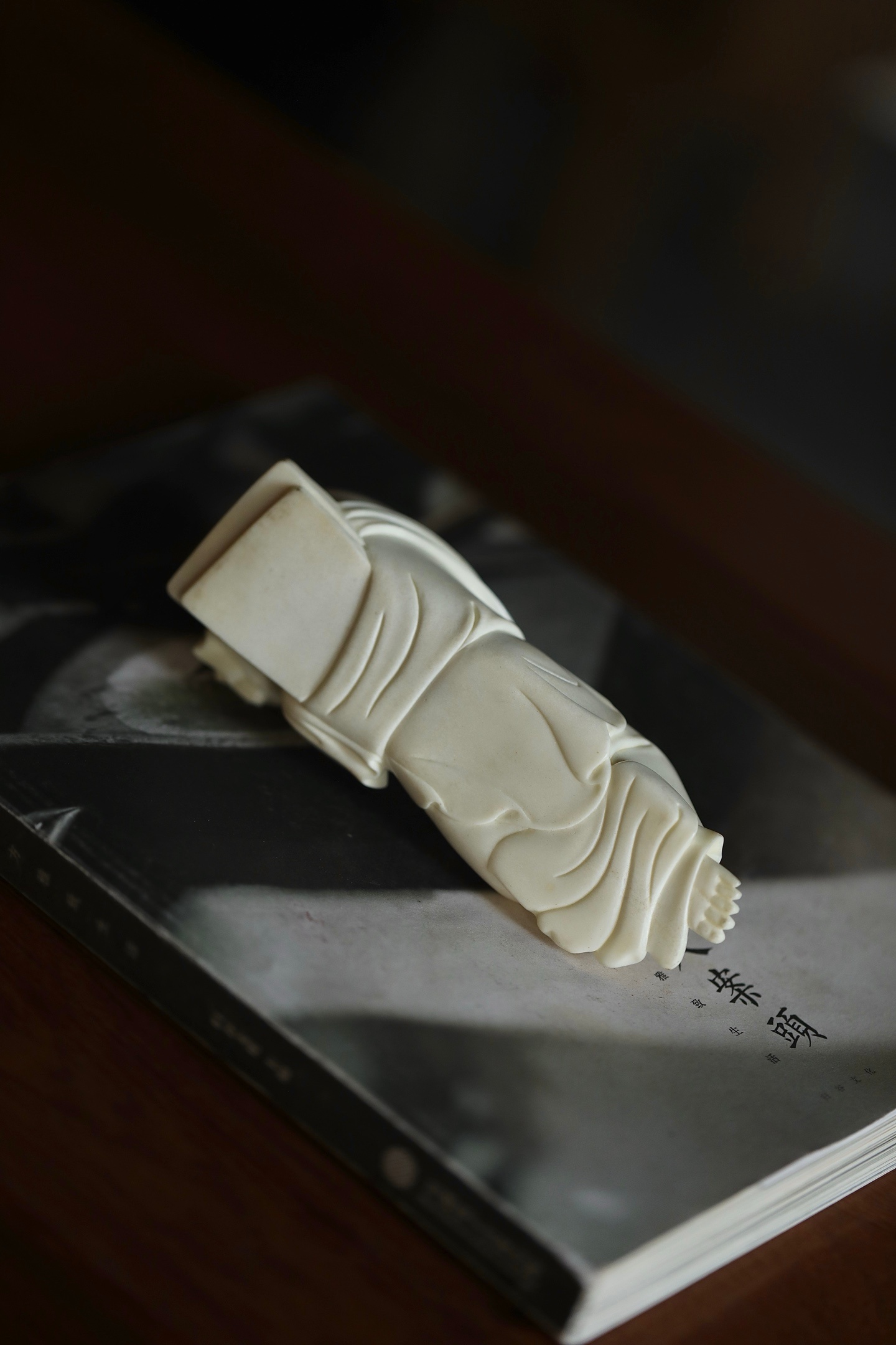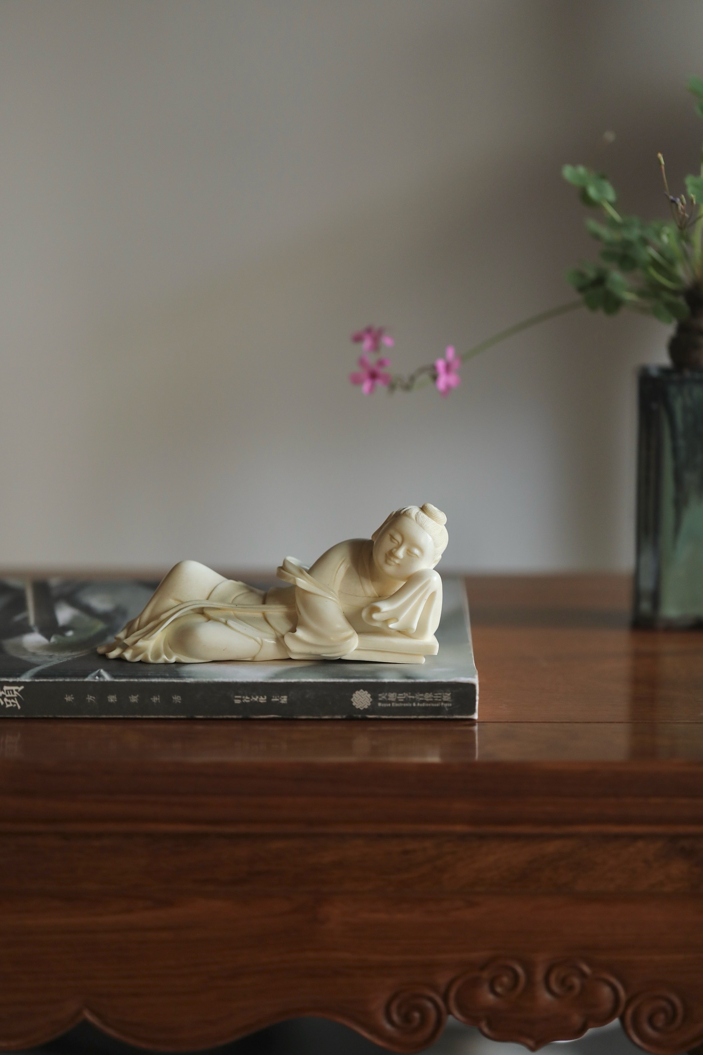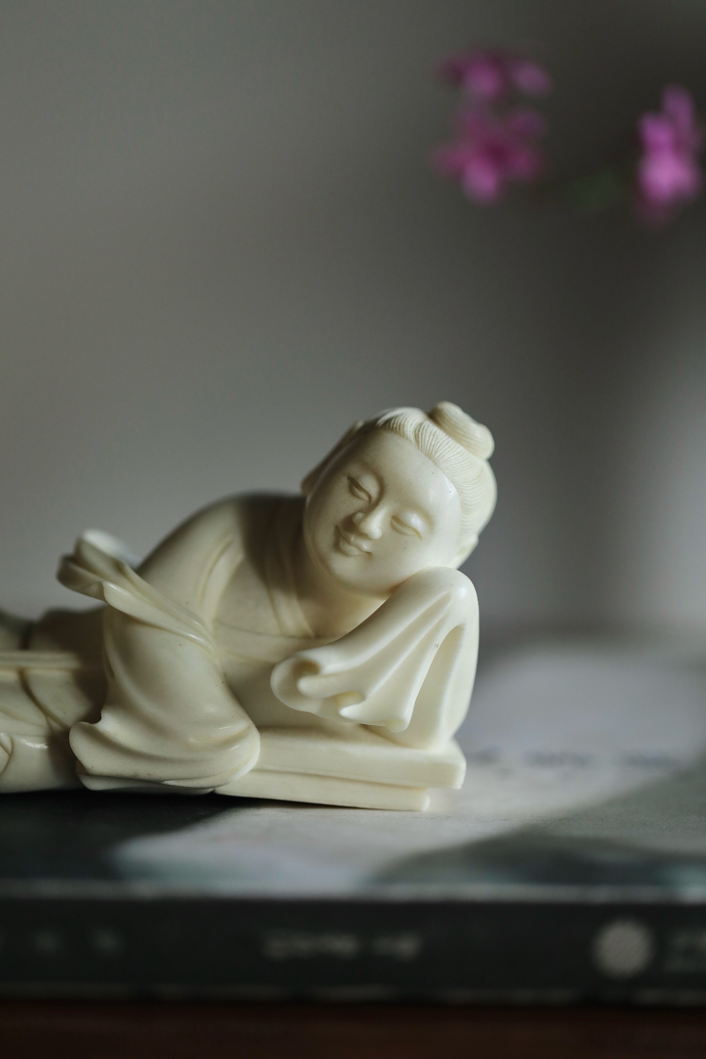 仕女侧卧伏枕,发髻高挽,衣袂垂拂,线条柔婉流畅,姿态慵懒恬和,枕下暗合镇纸之实用,文玩与陈设兼得。置于案头,如伴佳人静读,温婉娴静,涤尽尘嚣,暗合“红袖添香夜读书”之文人雅意。