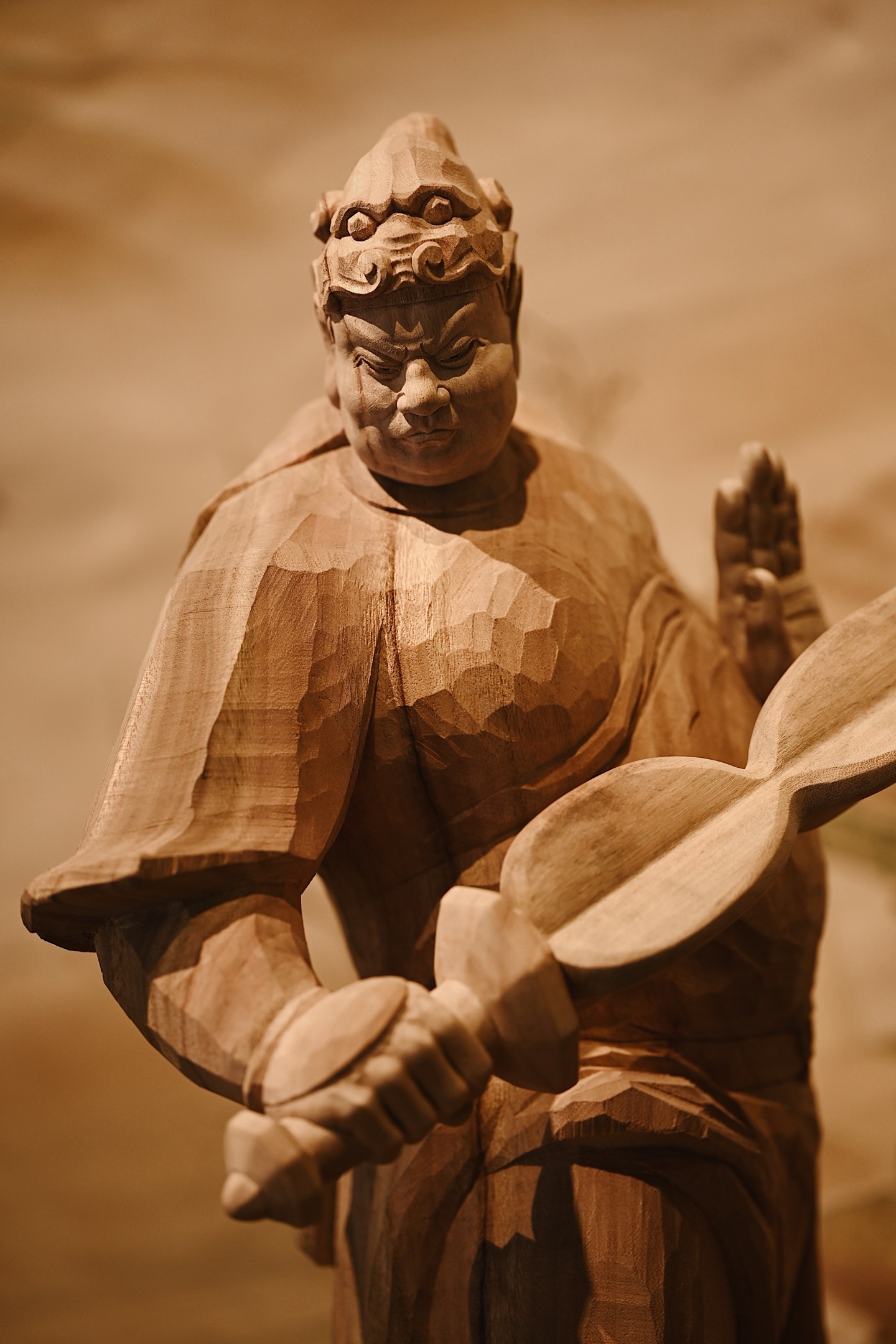 快刀雕刻,细腻生动,韦陀头戴凤翅兜鍪盔,相容坚毅,袍袖翻飞,姿态英武,韦陀一手横举金刚杵,含威不露,奇伟神武。