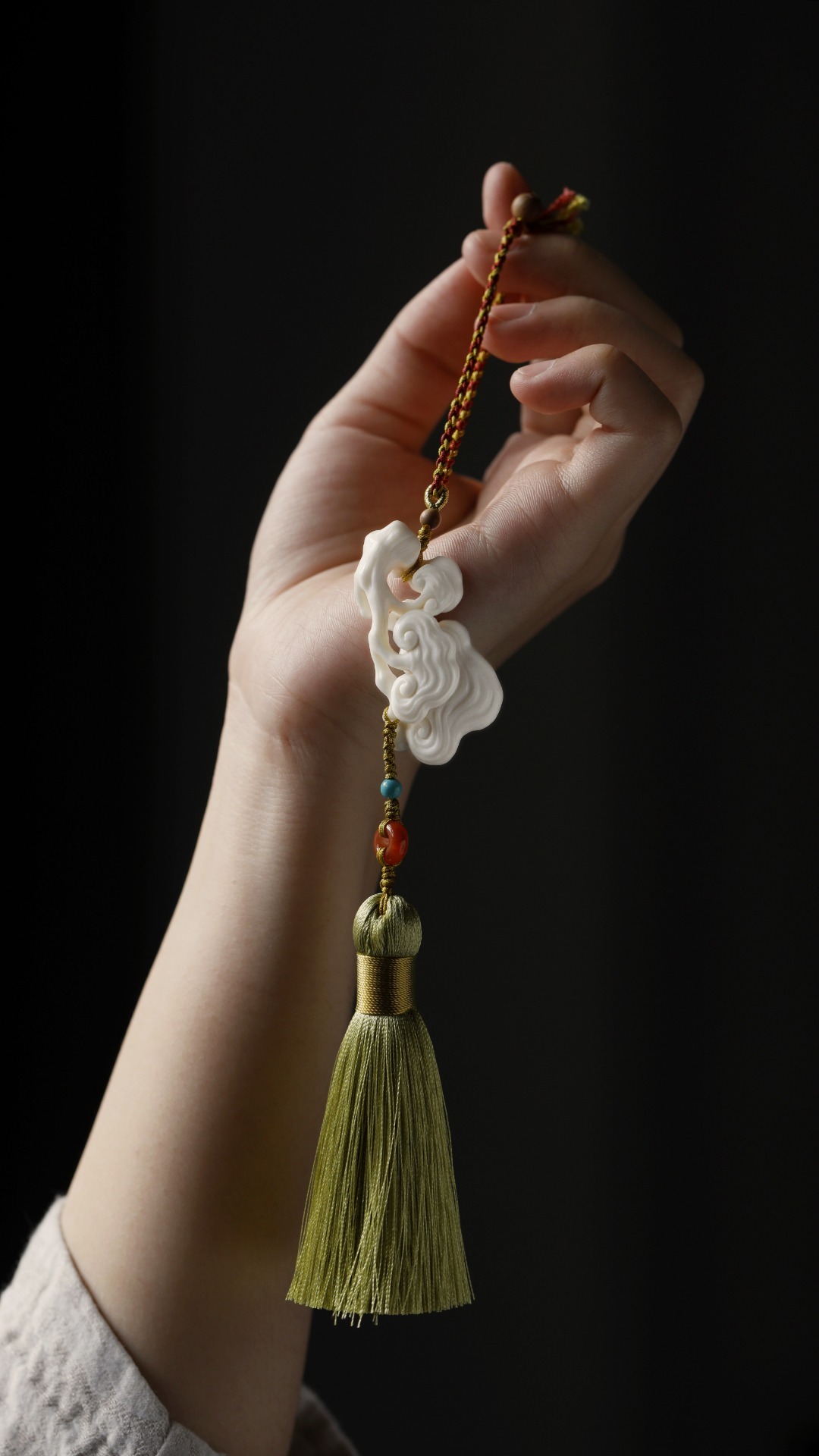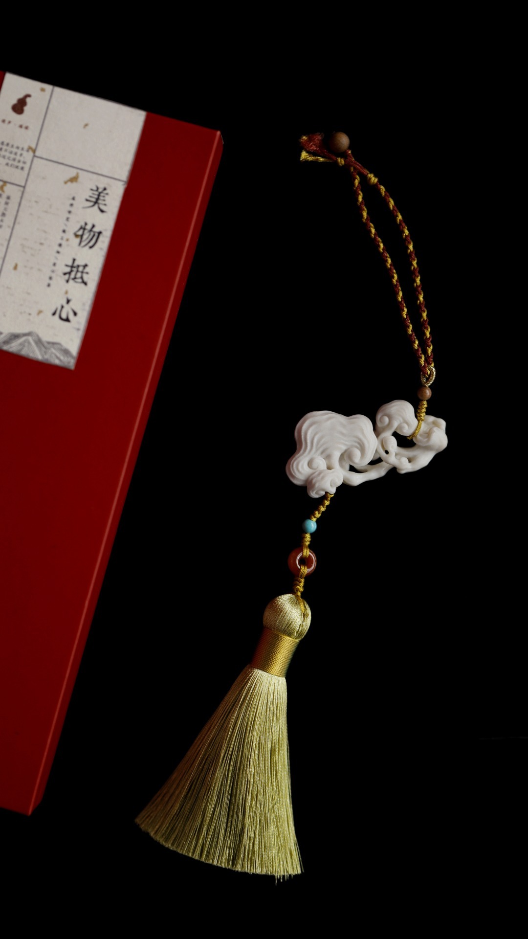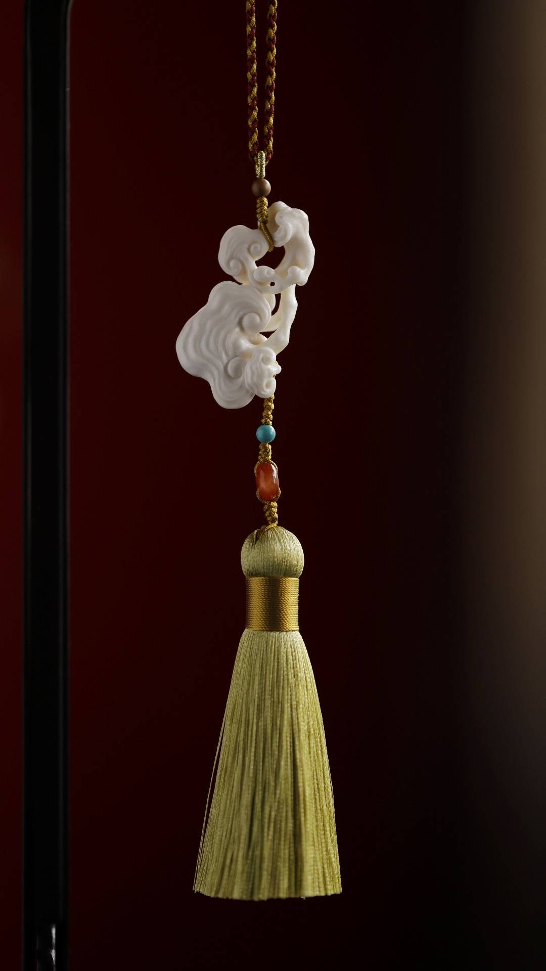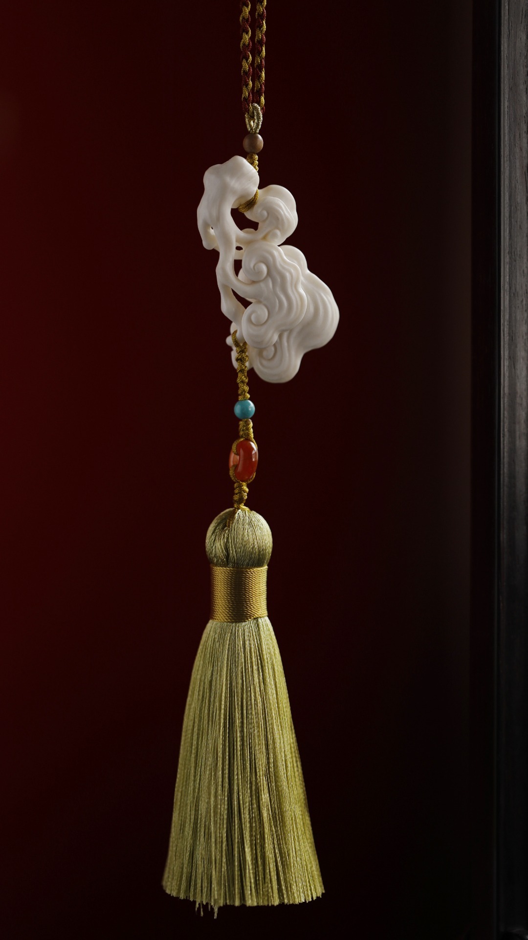料质洁白细腻,手工雕灵芝数朵,象征吉庆祥和、祥瑞福祉,配以宫廷风流苏,古趣盎然!