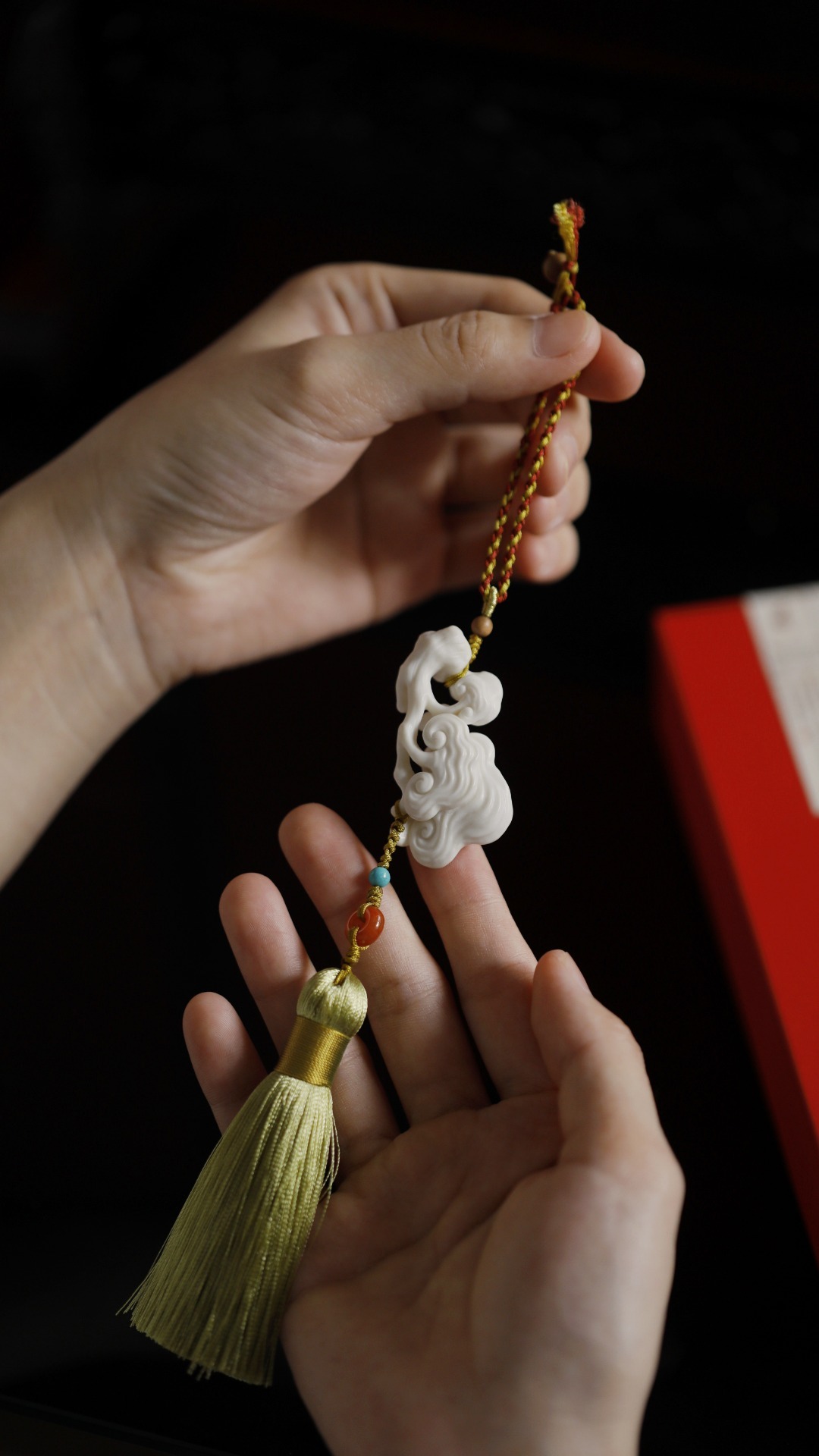 鹿角【灵芝】挂件料质洁白细腻,手工雕灵芝数朵,象征吉庆祥和、祥瑞福祉,配以宫廷风