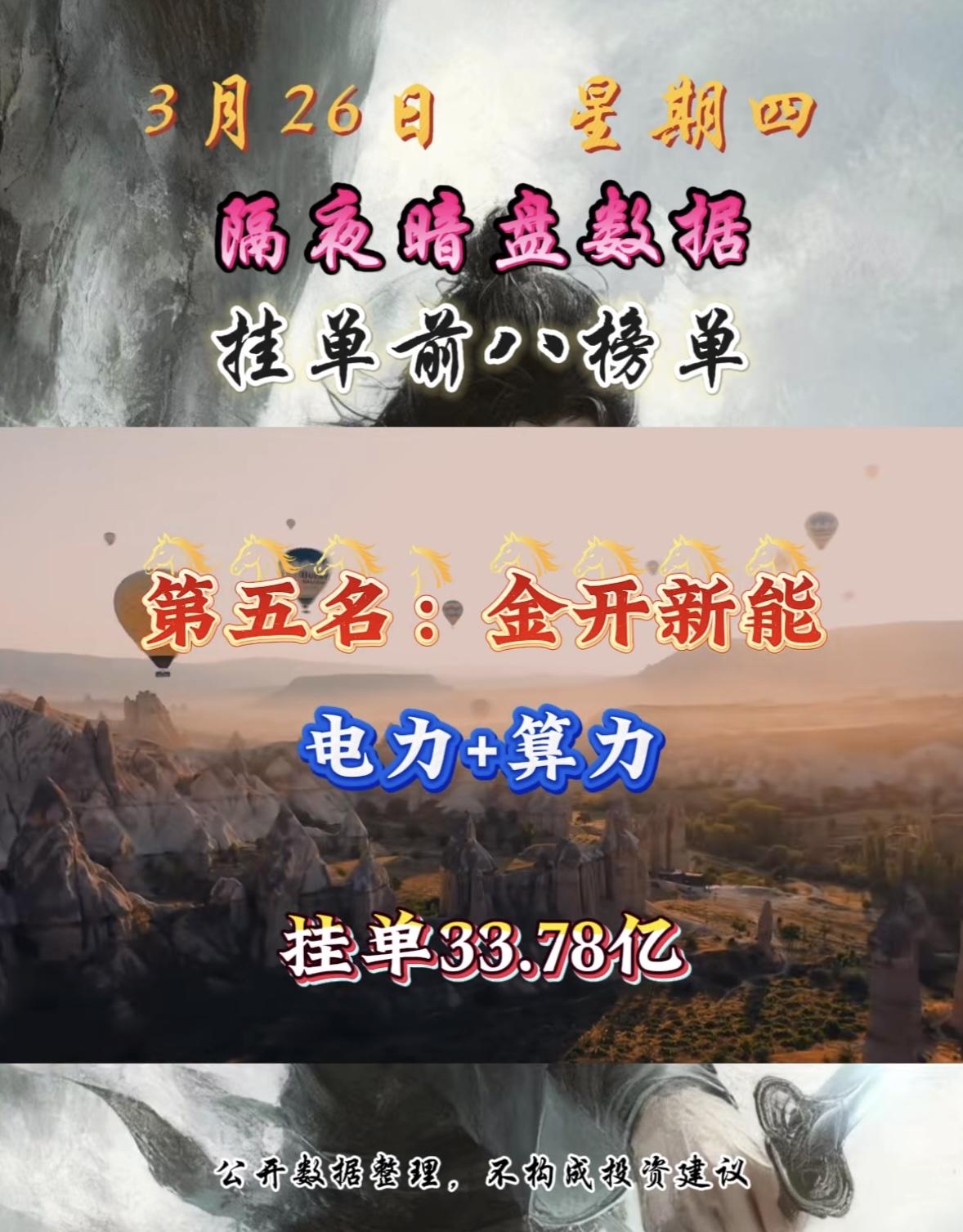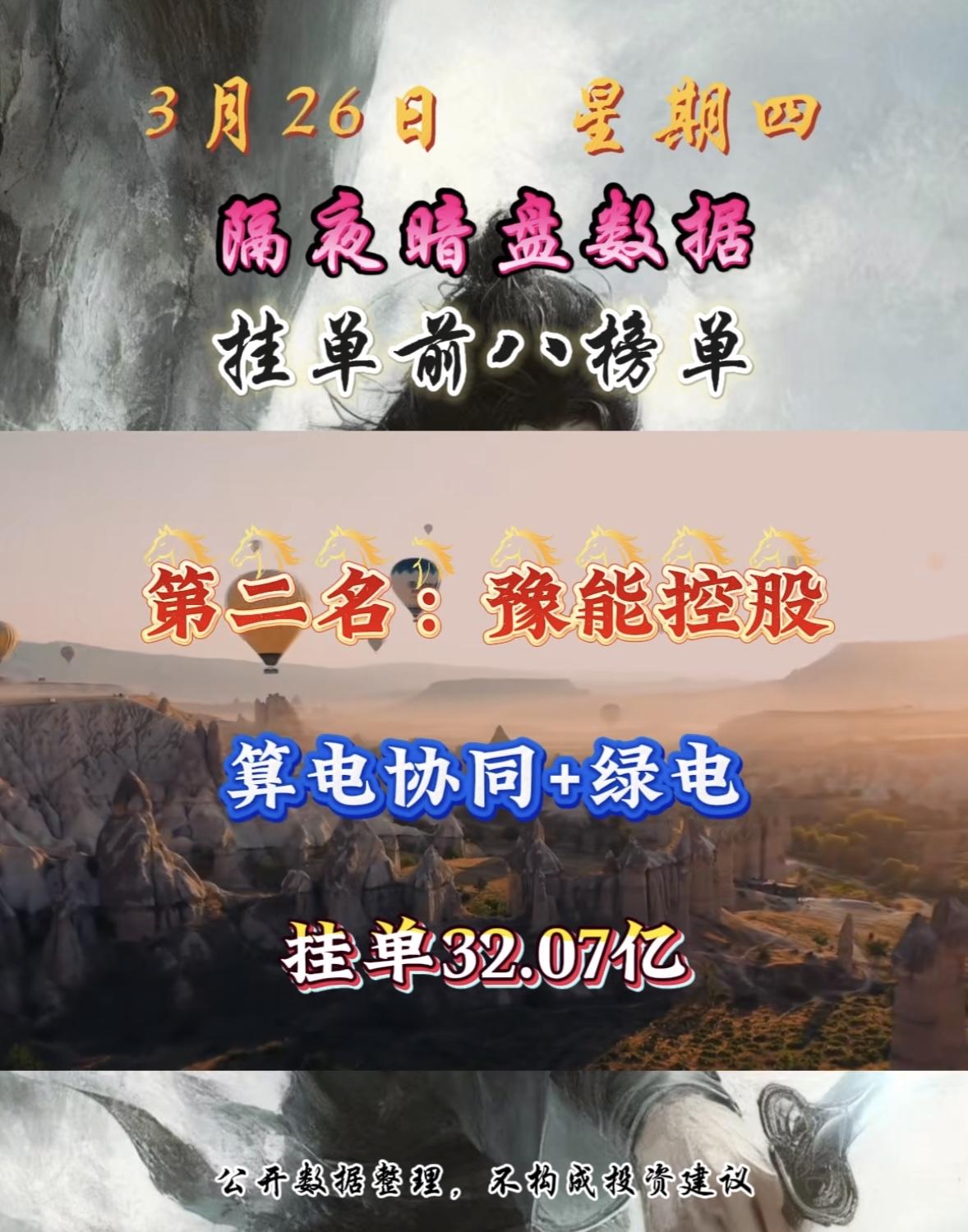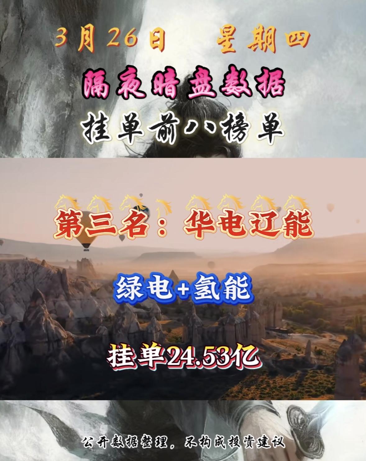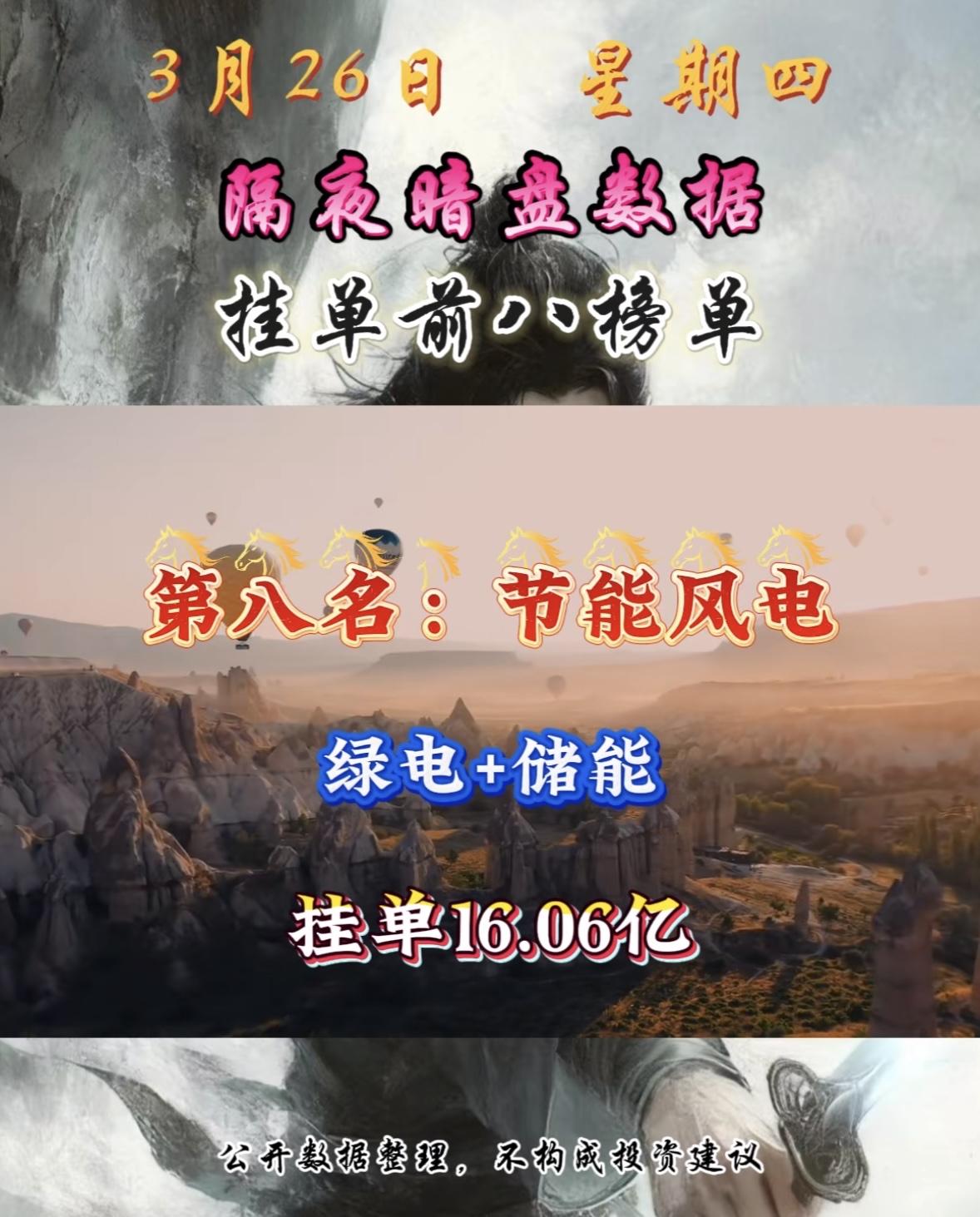 3月26日周四暗盘隔夜挂单排行榜出炉 3月26日节能风电这是要搞大事情啊!绿电+储能概念,还挂单16.06亿,太猛了。 回顾3月25日,电力板块就很强势,绿电ETF华夏(562550)成交额居同类第一。当时节能风电就涨停了。而且2026年“算电协同”成国家战略,要推动“绿电+储能+算力集群”项目,国家还要求枢纽节点新建算力设施绿电应用占比达80%以上。 不过在3月16日,节能风电曾走出巨阴形态,单日跌幅6.33%,成交量放大。当时大家都在猜是洗盘还是见顶。这次强势上榜,它后续走势会怎样呢?很值得期待!