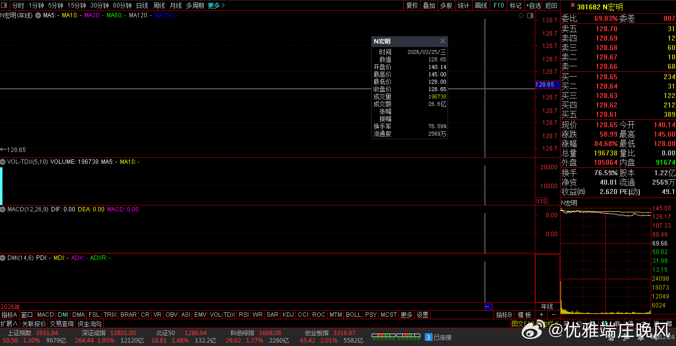 收盘价:128.65元。涨跌幅: 84.68%。净流入: 8.02亿