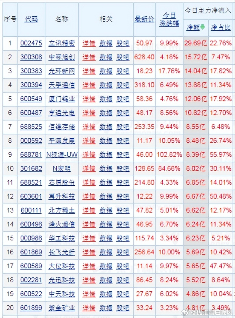 视野盘面:整体呈现:个股普涨。当日市场:呈现放量突破特征。两市成交:达21700亿元,连续三日站稳2万亿元大关。北向资金:净流入92.46亿元,市场情绪显著修复 。立讯精密、中际旭创、光环新网、天孚通信等个股成为资金净流入焦点。其中之一:立讯精密:单日获主力资金净流入29.69亿元。中际旭创、光环新网、天孚通信分别获:净流入15.72亿元、14.04亿元、13.88亿元 。今日复盘:主力资金:流入幅度较大龙头股票: