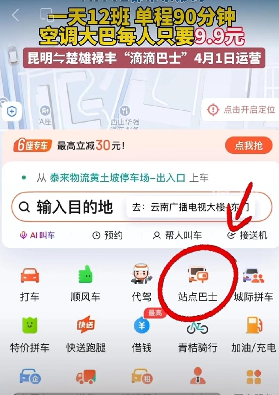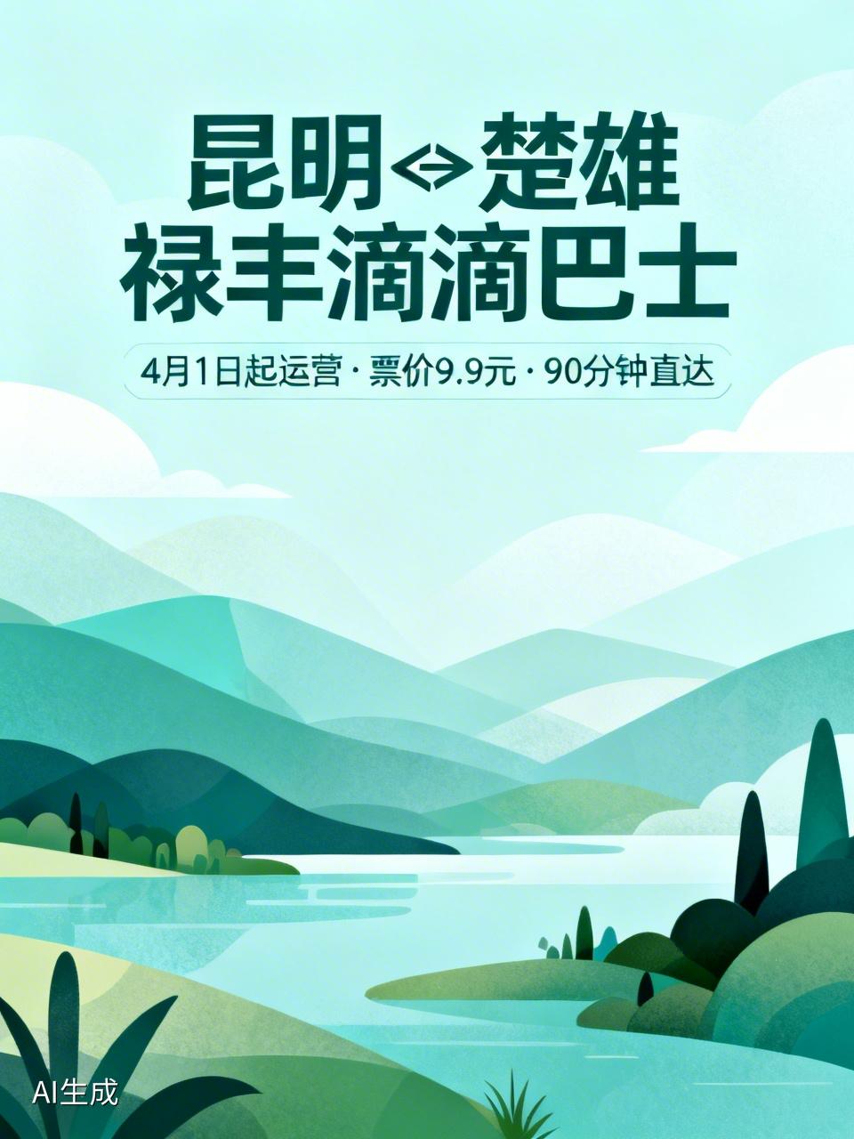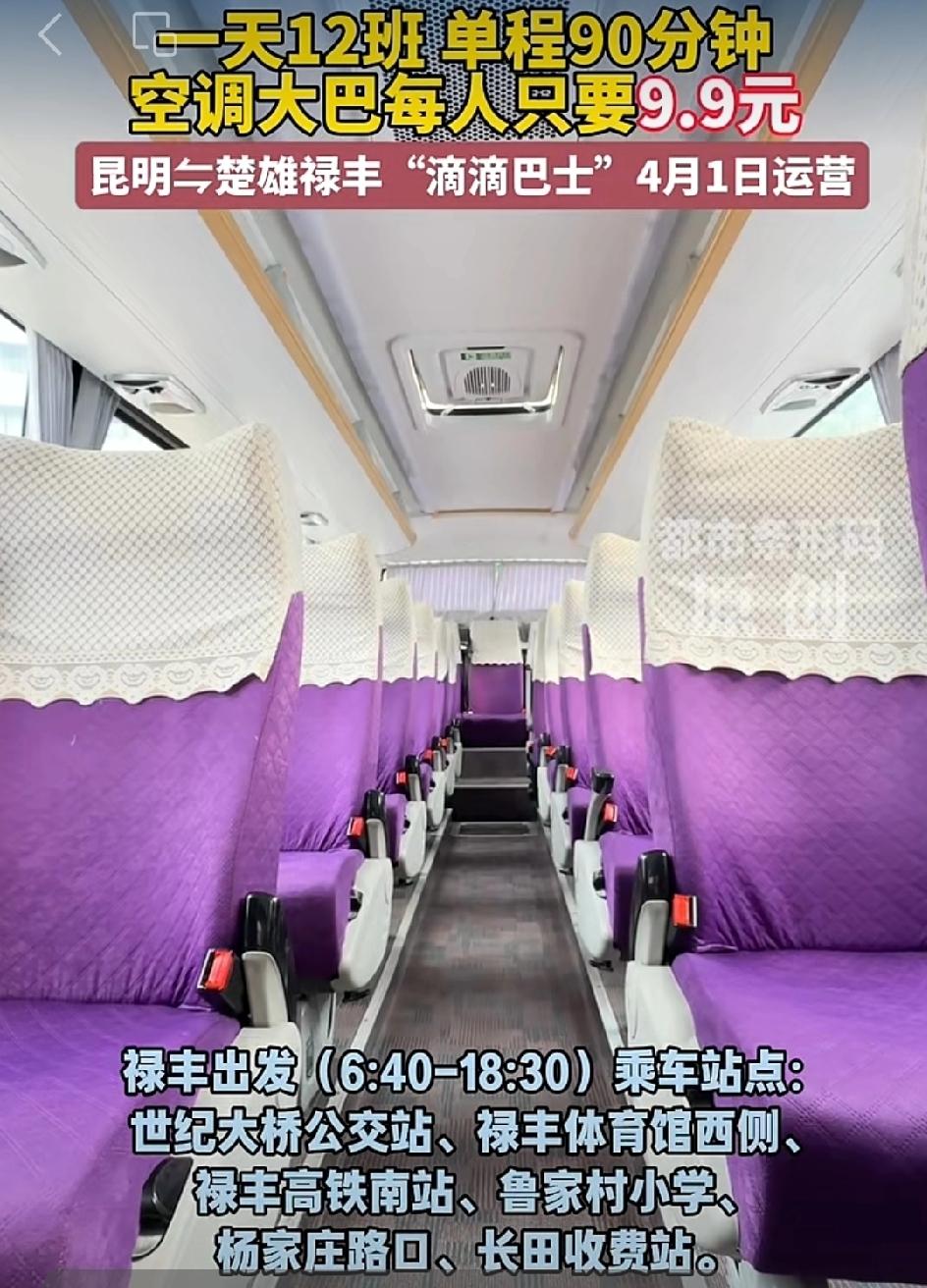 昆明和楚雄禄丰的朋友们有福利啦![福][福][福] 🚎🚎🚎4月1日起,云南交运携手滴滴出行打造的昆明⇋楚雄禄丰“滴滴巴士”正式开启运营。每日设有12个班次,每小时发一班车,单程仅需90分钟。并且票价十分实惠,只需9.9元! 这款新能源纯电动空调大巴安静又环保,一辆车可搭载30多名乘客。昆明设有3个乘车点,首班车7点30分发车,末班车16点30分发车;禄丰设有5个乘车点,首班车6点40分发车,末班车18点30分发车。 野生菌季想去禄丰品尝新鲜美味,或是日常往返于两地,选它肯定没错!