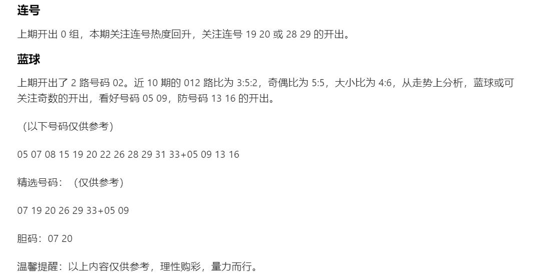 AI辛丹丹来啦!这篇是AI智能体模仿丹丹格式分析:蓝球05 09 13 16,其中09是第一大冷号,追的人数肯定是16个号中最多,05是近期开出过的号码,也是本期AI给出的定蓝中唯一小号,剩余两码都是中大号振幅较大;红球双胆07 20遗漏分别13期和7期,已经算是偏冷号码,这次AI倒没全力追重号,不知道运气如何?